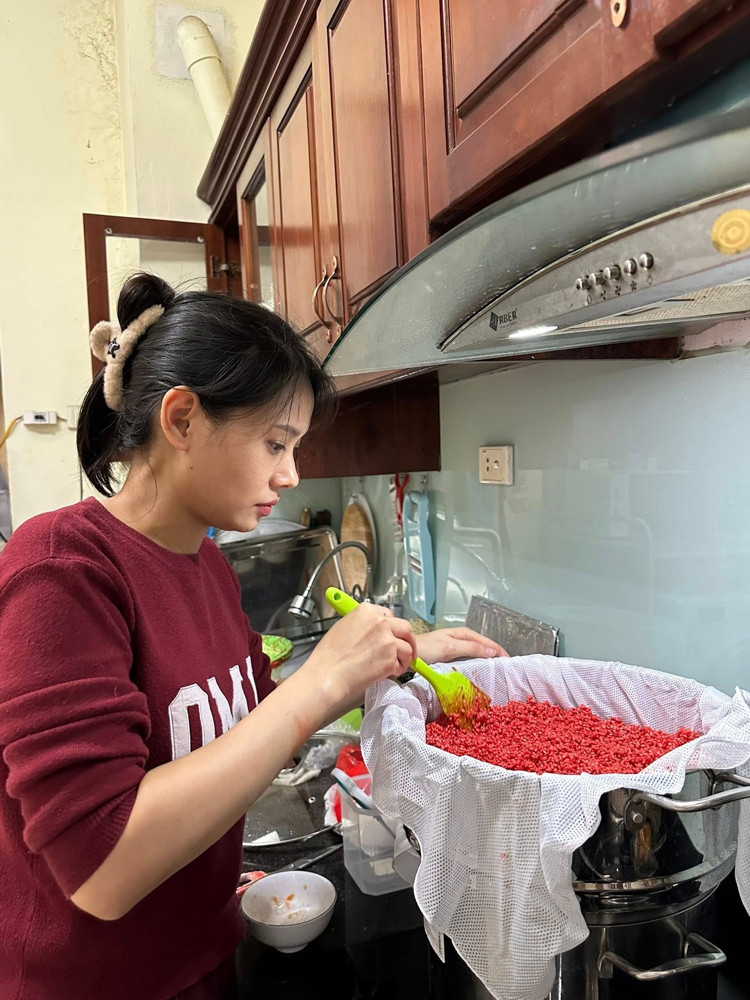 Minh Khuê đồ xôi gấc, món ăn không thể thiếu trên mâm cỗ của người miền Bắc-Ảnh: Nguyễn Tuyết