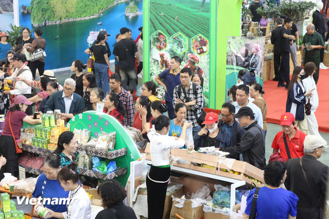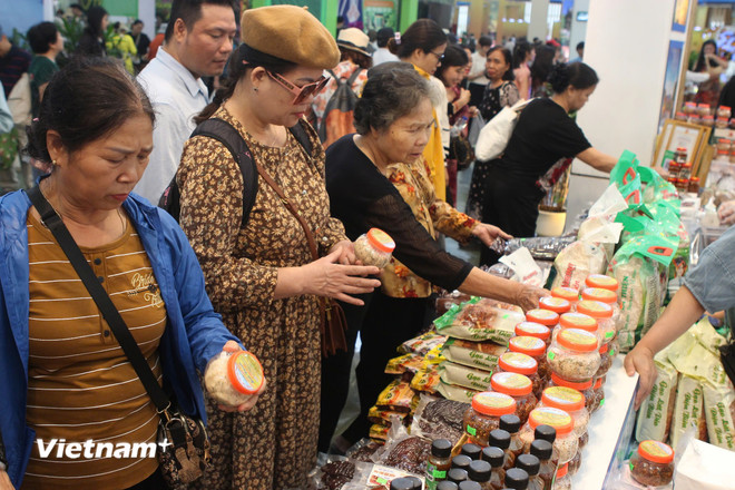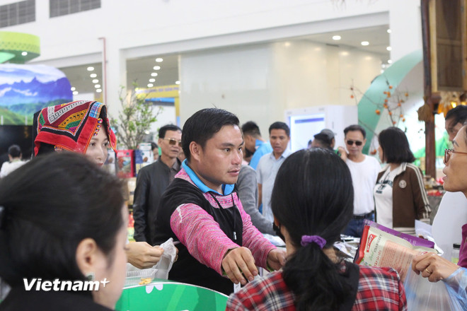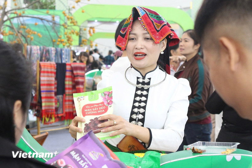 Hàng Á Của đang giới thiệu sản phẩm của tỉnh Sơn La, một trong những gian hàng thu hút đông đảo khách tham quan. (Ảnh: Phi Tuấn/Vietnam+)
