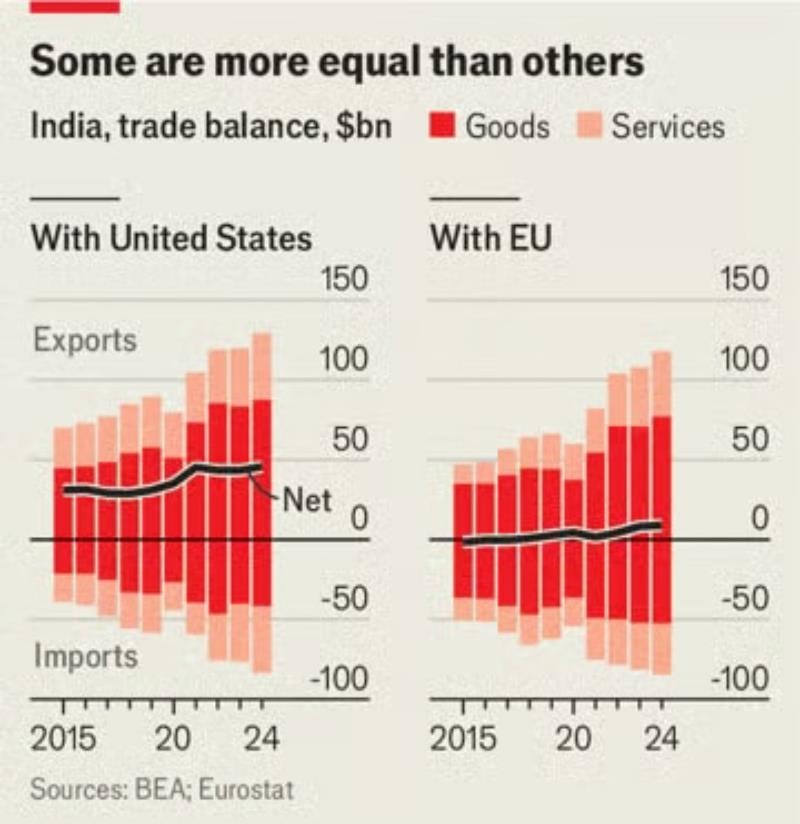 Cán cân thương mại của Ấn Độ với Mỹ và EU giai đoạn 2015–2024. Biểu đồ: The Economist