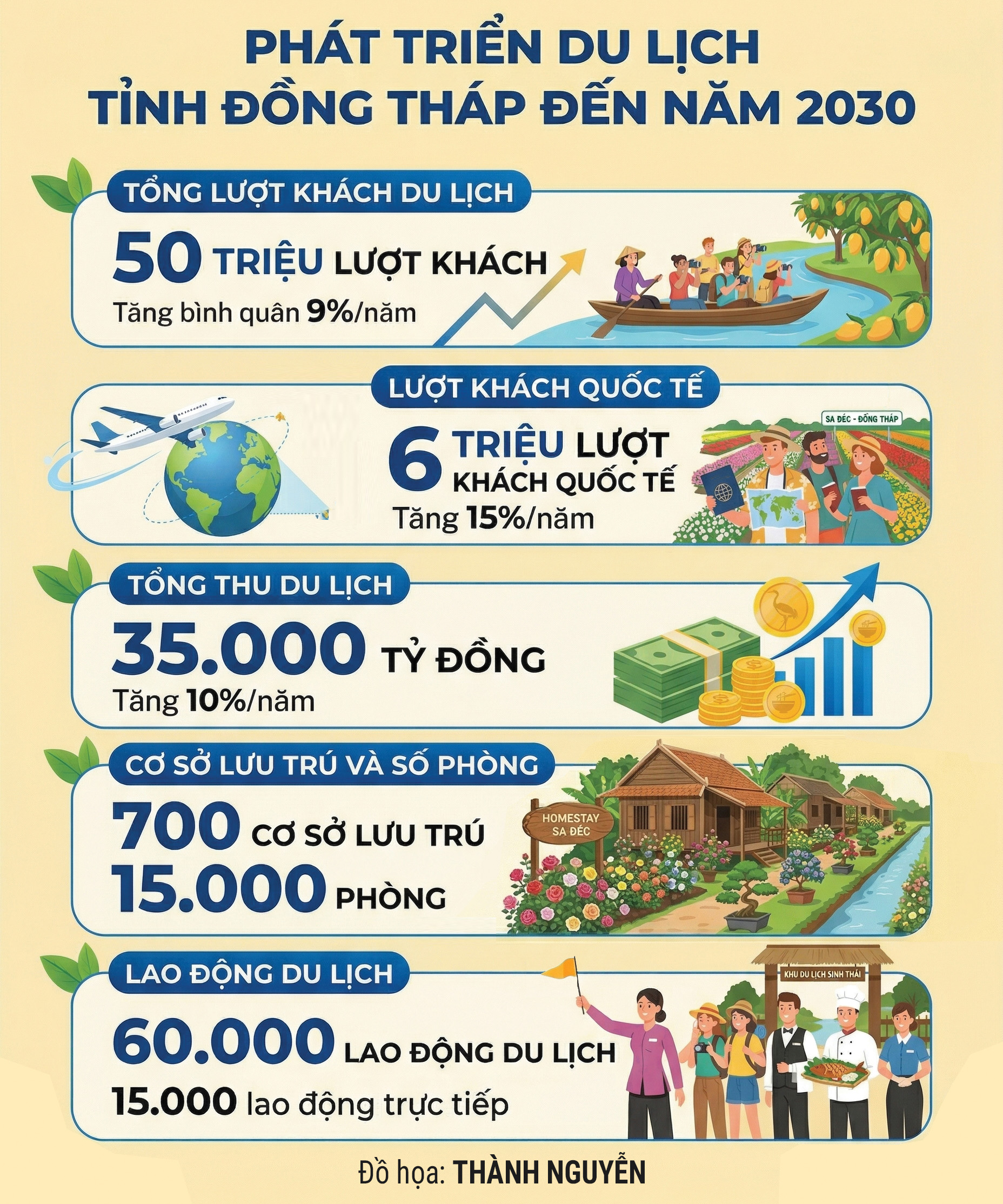 Thực tế cho thấy những tín hiệu tích cực. Năm 2025, toàn tỉnh đón hơn 7,35 triệu lượt khách, tăng 19,8%; trong đó, khách quốc tế đạt hơn 766.000 lượt, tăng 23,6%; tổng thu du lịch đạt 4.158 tỷ đồng, tăng 21,5%. Trên đà này, năm 2026, tỉnh đặt mục tiêu đón 8 triệu lượt khách, doanh thu 4.800 tỷ đồng. Đây vừa là áp lực, vừa là thước đo cho quyết tâm đưa du lịch Đồng Tháp phát triển lên tầm cao mới.