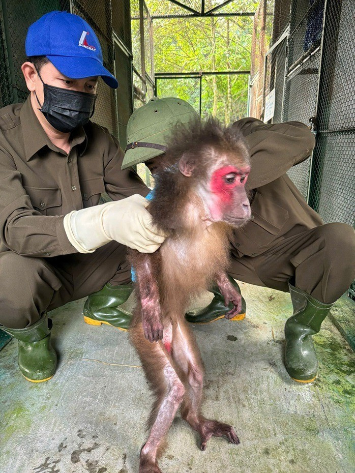Tiếp đó, Trung tâm Cứu hộ, Bảo tồn và Phát triển sinh vật thuộc Vườn quốc gia Phong Nha - Kẻ Bàng tiếp nhận một cá thể khỉ mặt đỏ nặng khoảng 5 kg do UBND phường Đồng Thuận bàn giao. Ảnh: TTXVN.
