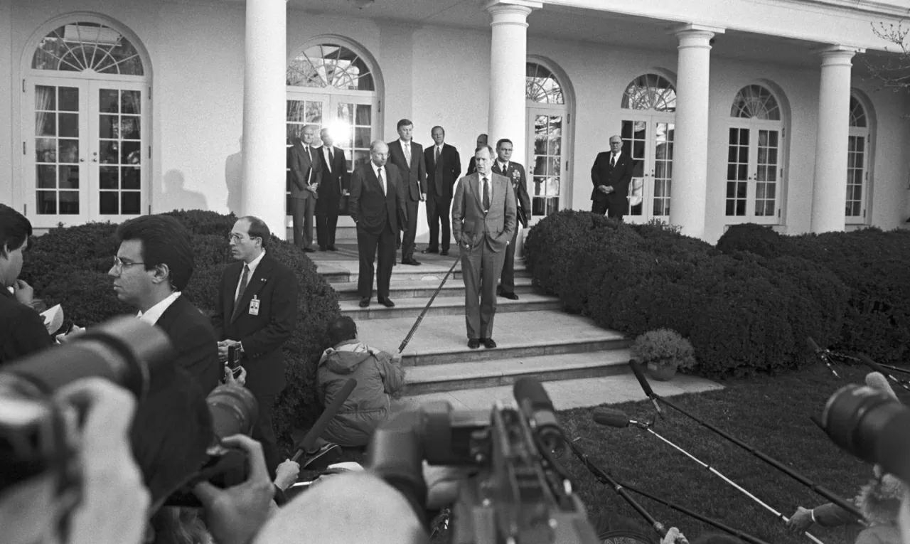 Tổng thống George H. W. Bush phát biểu trước báo chí tại Vườn Hồng vào tháng 2/1991, trong thời gian diễn ra Chiến tranh vùng Vịnh. (Nguồn: CNN)