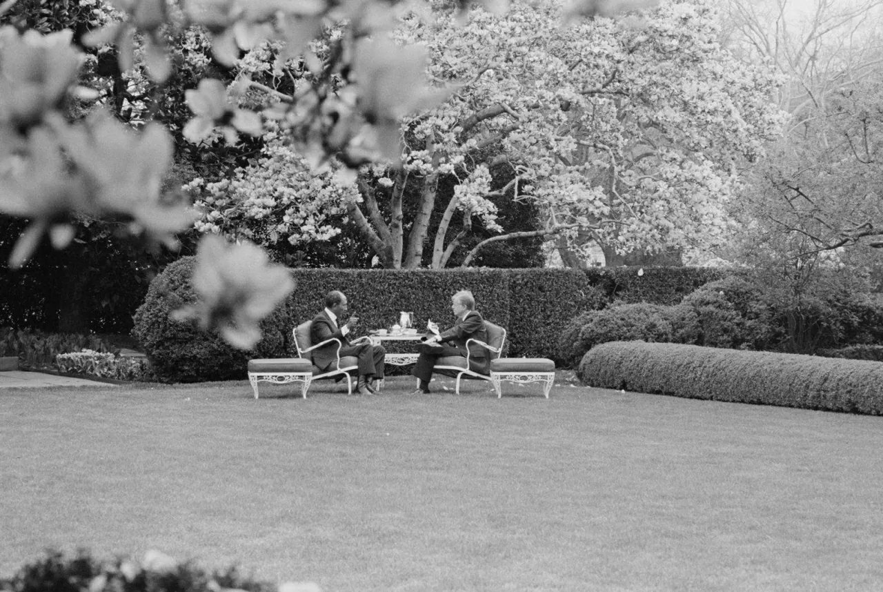 Tổng thống Jimmy Carter và Tổng thống Ai Cập Anwar Sadat dùng tiệc nhẹ tại Vườn Hồng Nhà Trắng, năm 1980. Một năm trước đó, ông Sadat, ông Carter và Thủ tướng Israel Menachem Begin đã ký các hiệp định hòa bình, chấm dứt 31 năm chiến tranh giữa Ai Cập và Israel. (Nguồn: Library of Congress)