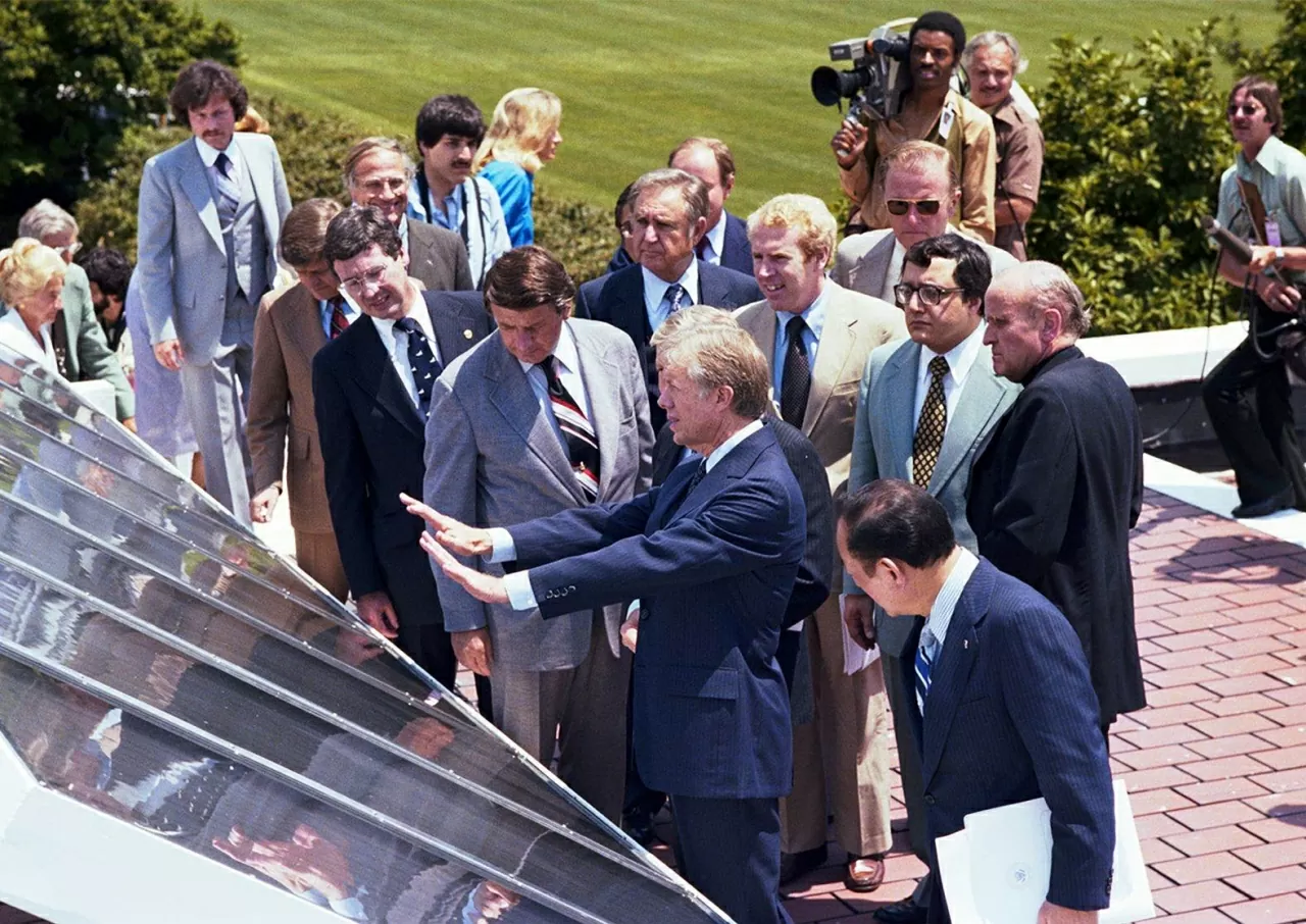 Tổng thống Jimmy Carter cho các phóng viên xem tấm pin năng lượng mặt trời mới được lắp đặt tại Vườn Hồng vào tháng 6/1979. Những tấm pin này sau đó bị tháo dỡ dưới thời Tổng thống Reagan. (Nguồn: Jimmy Carter Presidential Library and Museum)