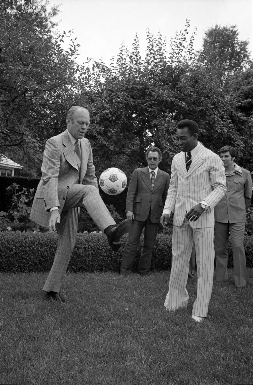 Tổng thống Gerald Ford tâng bóng cùng Pelé, ngôi sao bóng đá Brazil tại Vườn Hồng vào tháng 6/1975. (Nguồn: US National Archives and Records Administration)