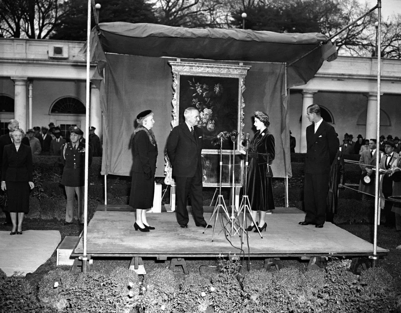Nữ hoàng Elizabeth, khi đó còn là Công chúa, trao tặng Tổng thống Harry Truman một chiếc gương và hai giá đỡ nến trong thời gian Nhà Trắng đang trùng tu quy mô lớn vào tháng 11/1951. (Nguồn: CNN)