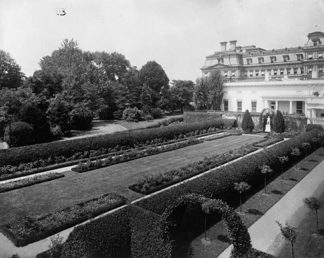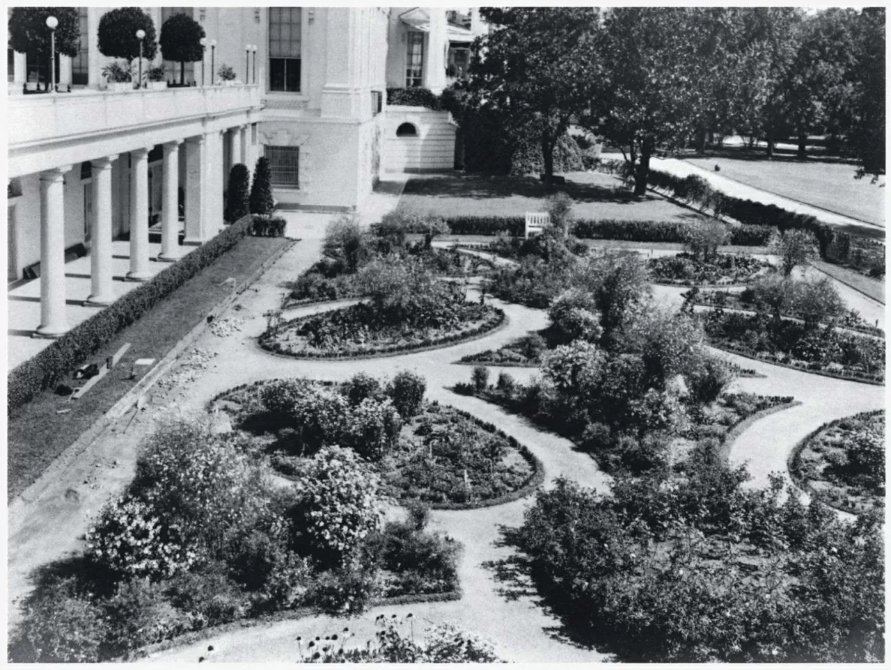 Hình ảnh khu vườn dưới thời Tổng thống Theodore Roosevelt, vào khoảng năm 1902 hoặc 1903. Nơi đây do Đệ nhất Phu nhân Edith Roosevelt thiết kế, với các bồn hoa tạo hình uốn lượn như họa tiết Paisley. (Nguồn: The White House)