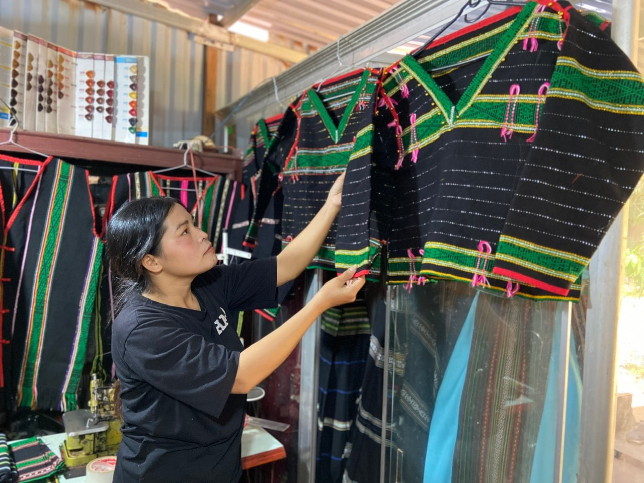 Sau khi hoàn thành khóa học may tại địa phương, chị H’Her chọn thổ cẩm làm hướng đi lâu dài. Từ những hoa văn truyền thống gắn với đời sống văn hóa người M’nông, chị mày mò nghiên cứu, sáng tạo thêm nhiều kiểu dáng mới. Váy áo cách tân, áo dài thổ cẩm, túi xách, ví nhỏ… được thiết kế tinh tế, vừa giữ hồn cốt văn hóa, vừa phù hợp thị hiếu hiện đại. Tiệm may của chị không chỉ là nơi cắt may, mà còn là điểm kết nối những nghệ nhân, bạn trẻ có tay nghề trong bon.