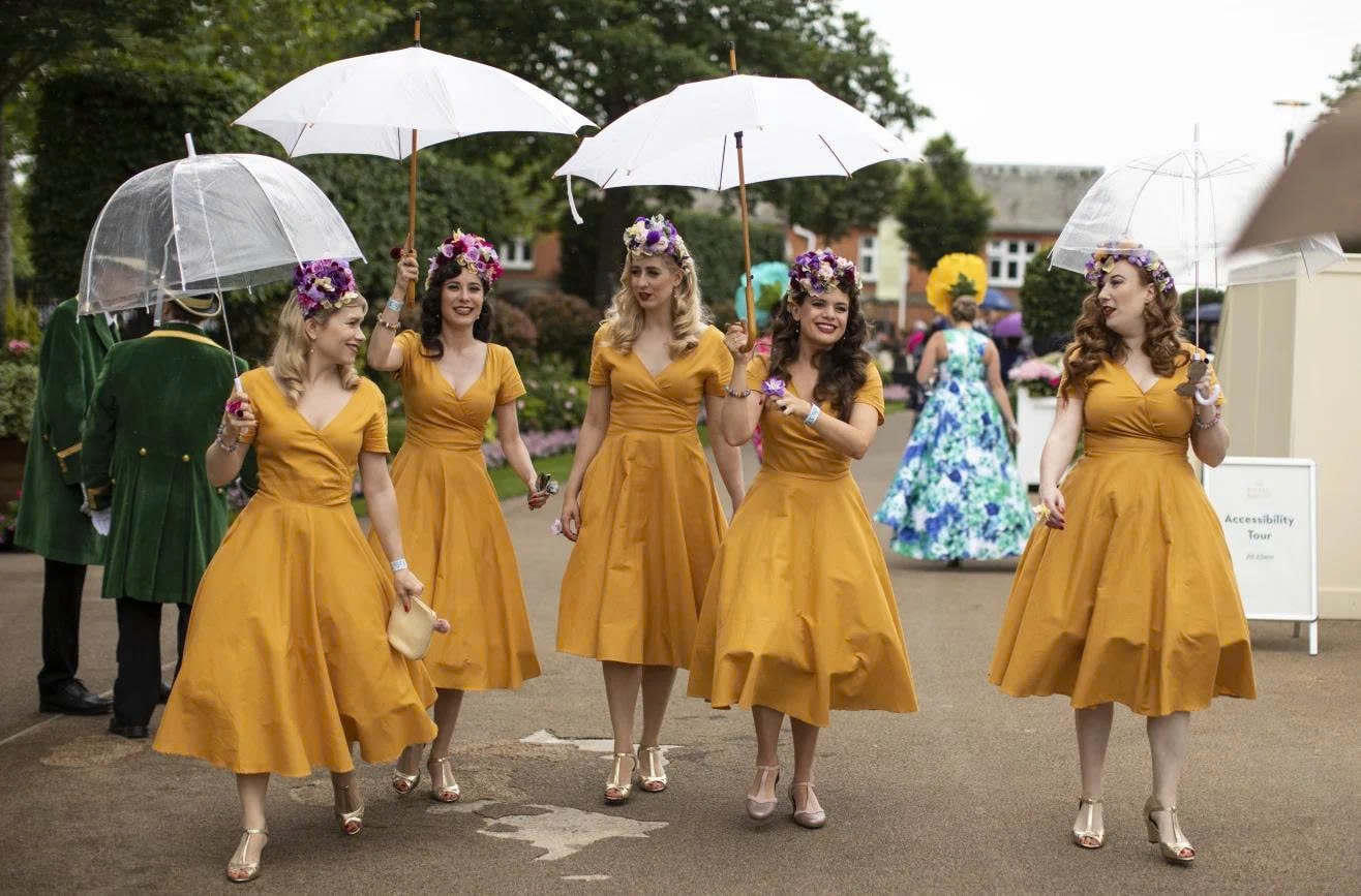 Dưới những chiếc ô nhẹ nghiêng, sắc vàng của váy áo cùng những vòng hoa rực rỡ tạo nên khung cảnh thanh lịch, nơi thời trang thăng hoa giữa không gian ngoài trời đầy sức sống. Ảnh: CNN