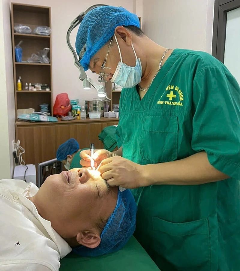 Bác sĩ Bệnh viện Đa khoa tỉnh Thanh Hóa tiến hành phẫu thuật lấy mỡ thừa mi trên, cắt da dư làm đẹp cho bệnh nhân.