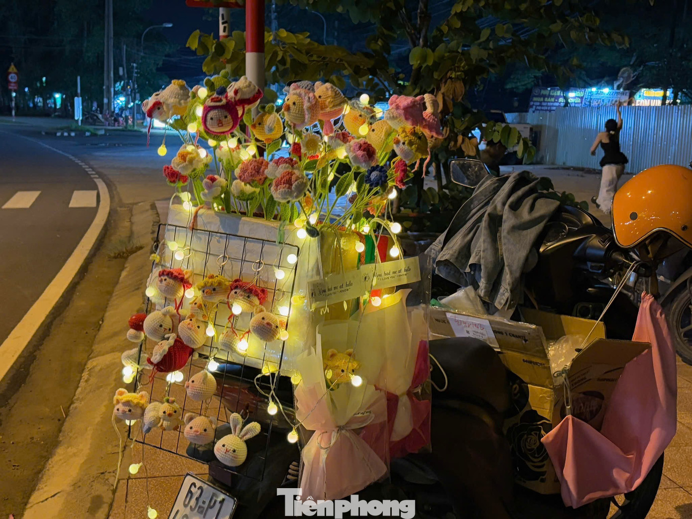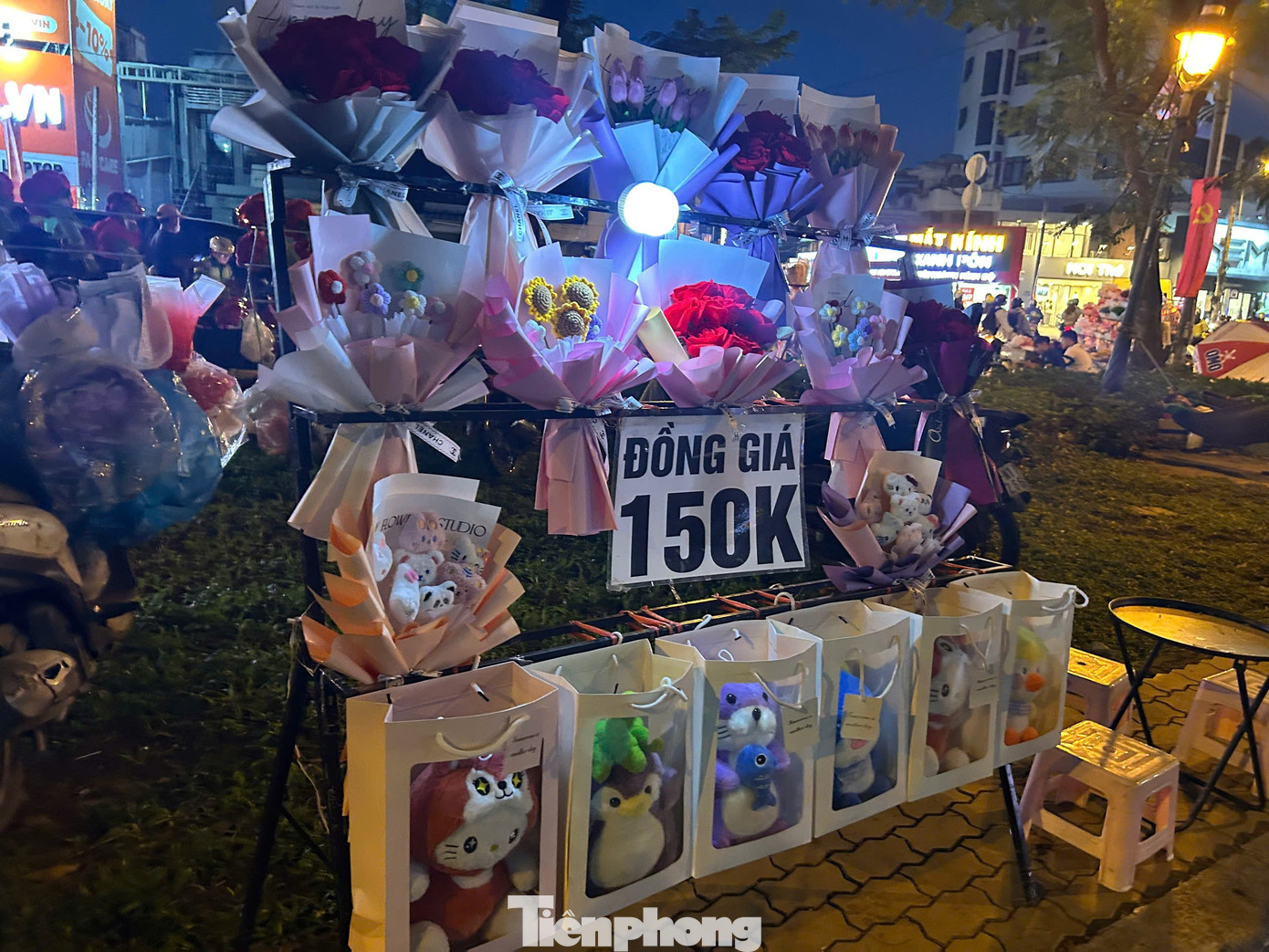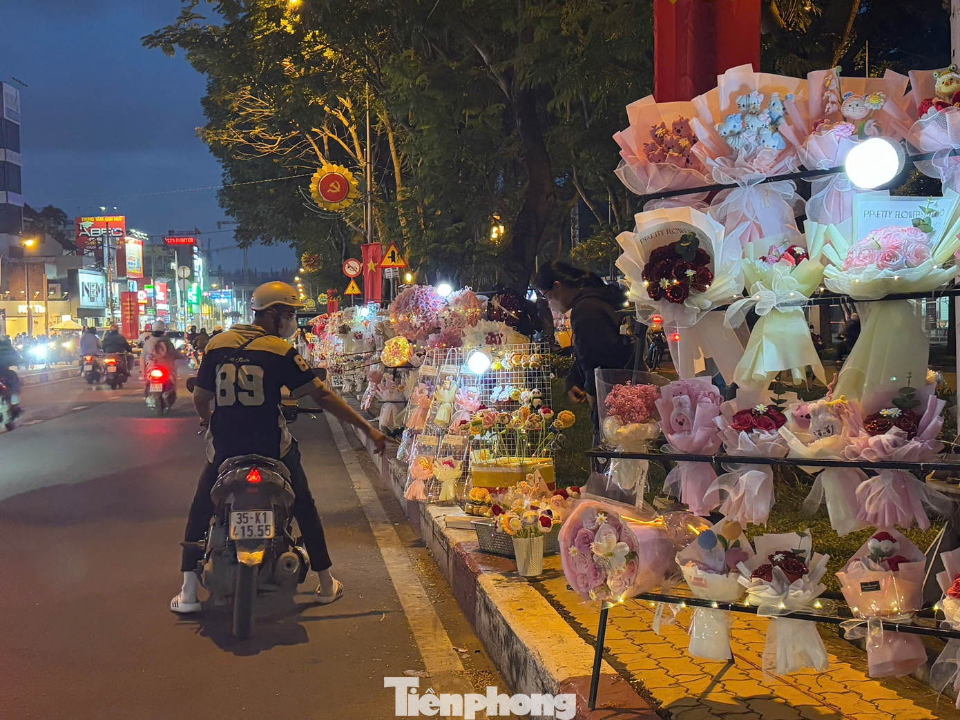 Nhiều sinh viên chọn dựng quầy hoa ngay trên yên xe máy hoặc gánh hàng di động. Cách bán này giúp họ dễ di chuyển, tiết kiệm chi phí thuê mặt bằng và thuận tiện trong những ngày lễ ngắn. Trên mỗi chiếc xe là vài thùng xốp đầy hoa, được trang trí bằng dây ruy băng, giấy gói đủ sắc màu.