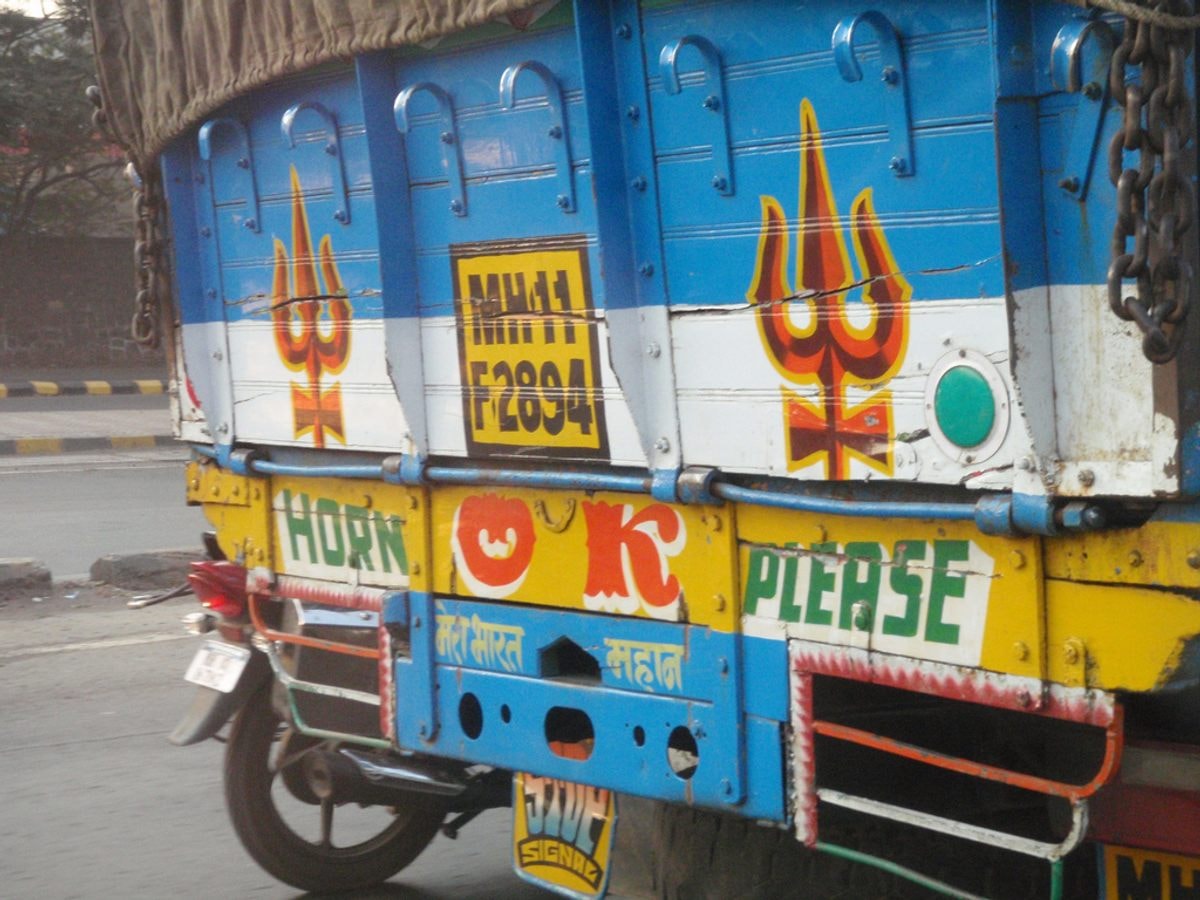 Dòng chữ “Horn OK Please” (xin bấm còi khi vượt) được sơn phía sau xe tải, bên dưới các hình vẽ trang trí. Ảnh: ix4svs/CC BY-SA 2.0