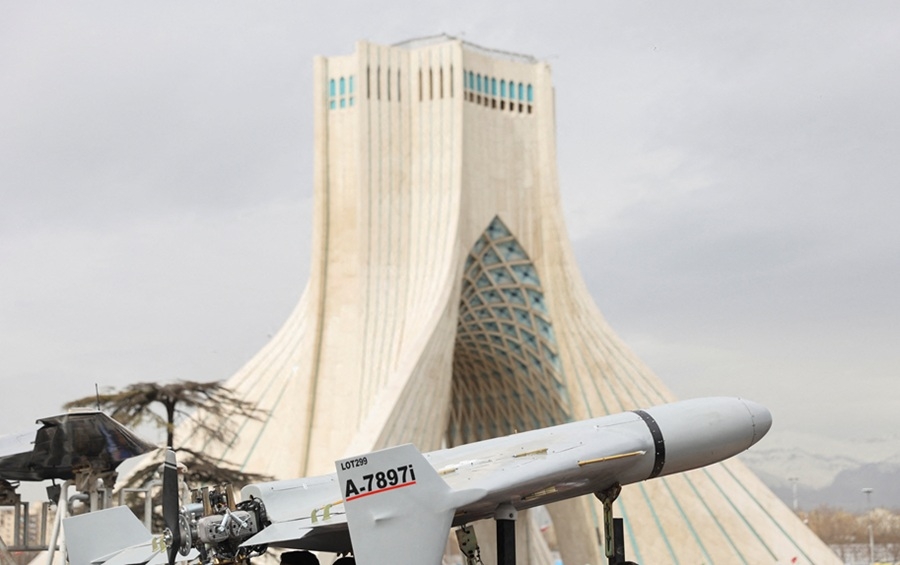 Một chiếc máy bay không người lái Shahed được trưng bày trong lễ kỷ niệm 47 năm Cách mạng Hồi giáo ở Tehran, Iran. Ảnh: Reuters