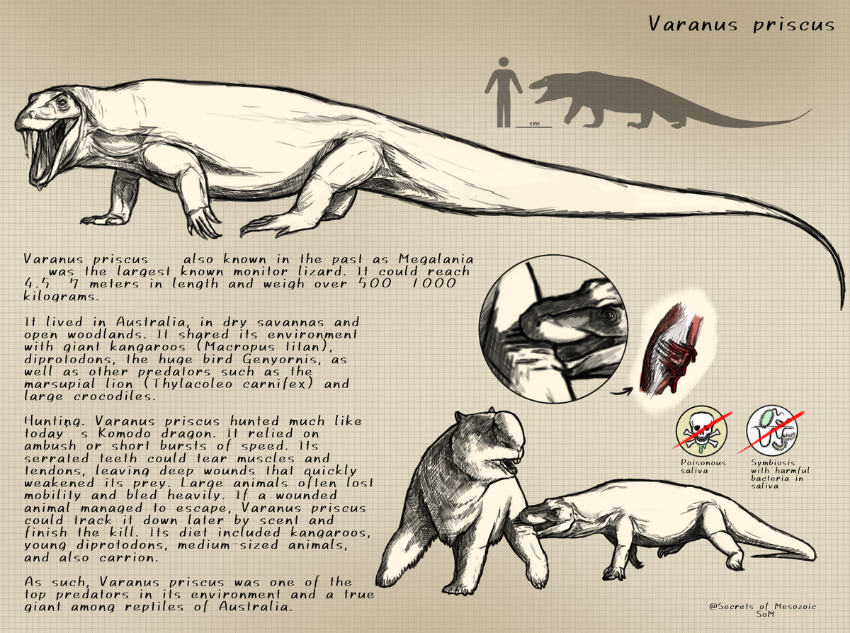 Đỉnh cao chuỗi thức ăn. Với kích thước vượt trội, Varanus priscus gần như không có kẻ thù tự nhiên trưởng thành. Nó có thể săn các loài thú lớn và thậm chí cạnh tranh với những kẻ săn mồi lớn khác trong hệ sinh thái cổ đại. Ảnh: Pinterest.