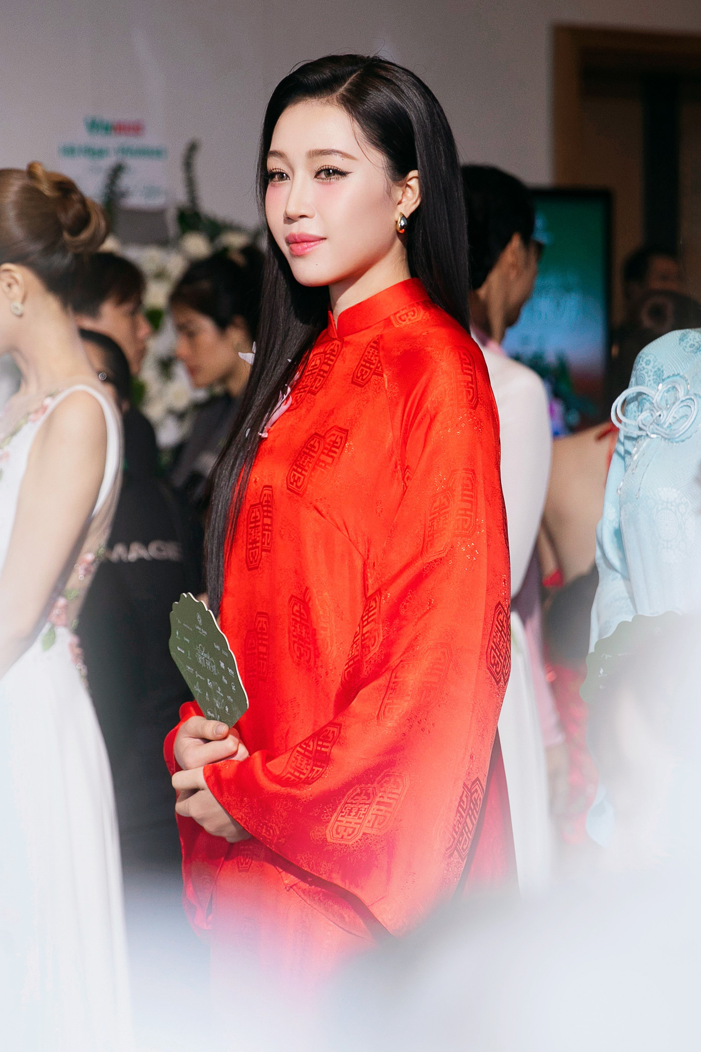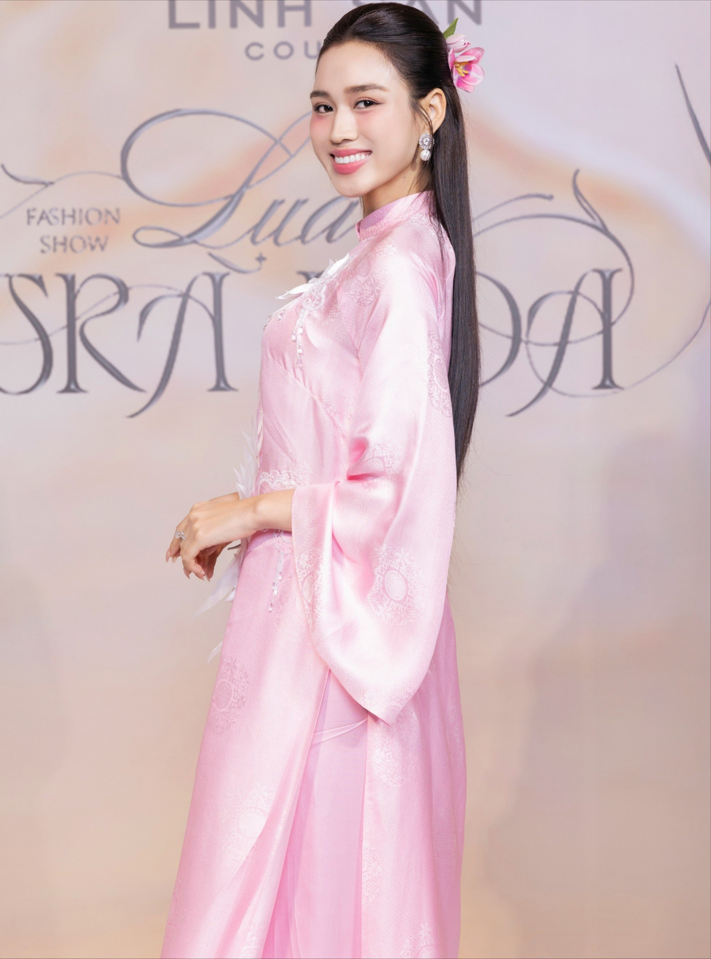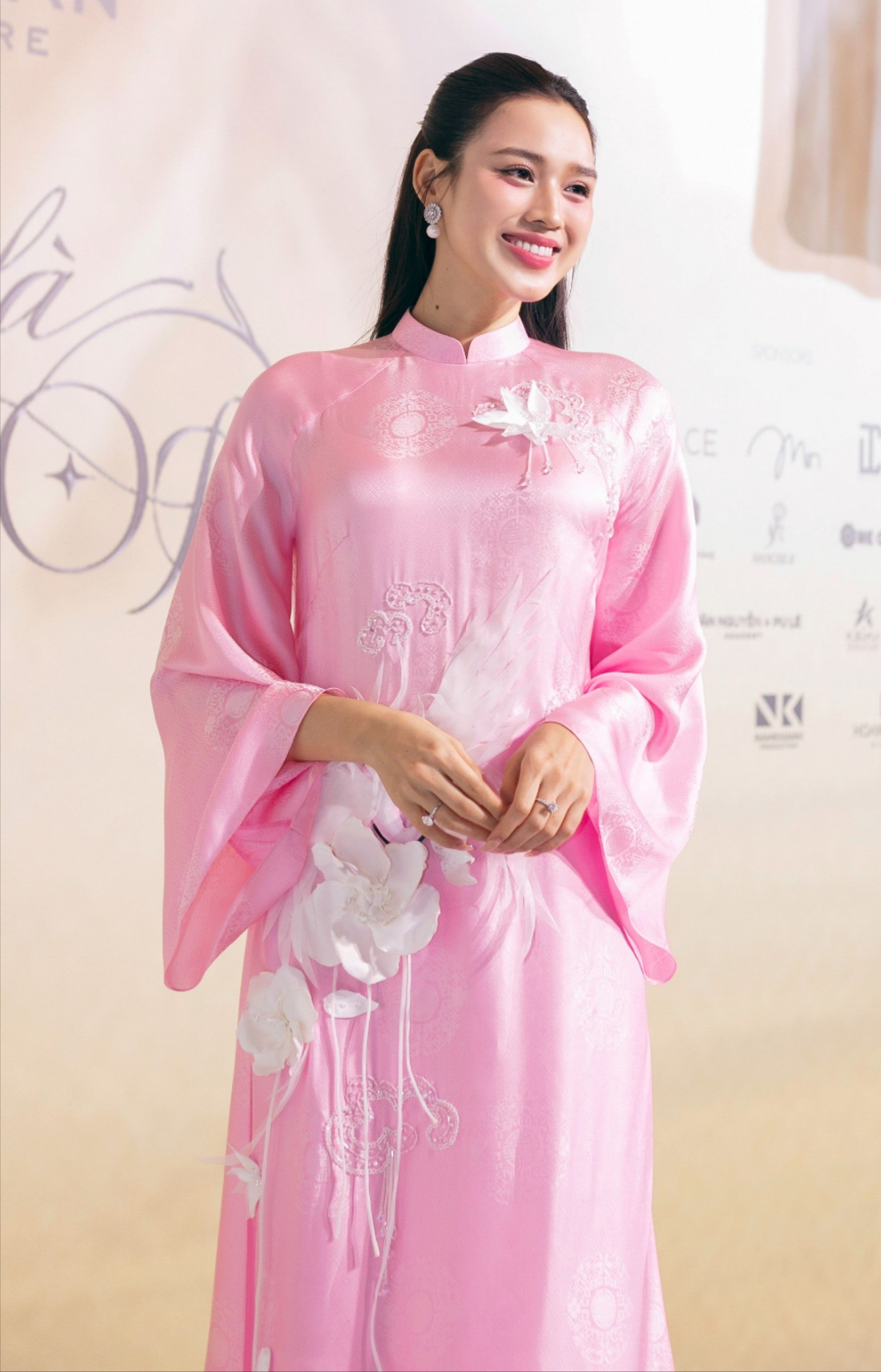 Trước đó, dàn người đẹp xuất hiện lộng lẫy trên thảm đỏ trong những thiết kế áo dài độc đáo. Hoa hậu Đỗ Thị Hà dịu dàng trong áo dài màu hồng pastel, đính hoa trắng.