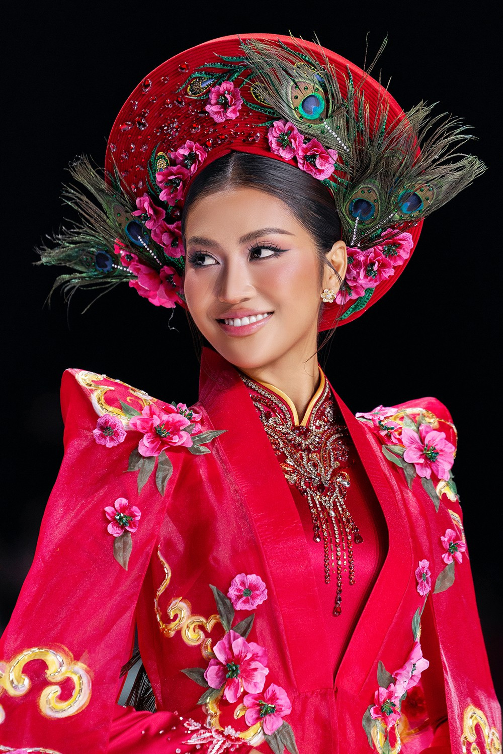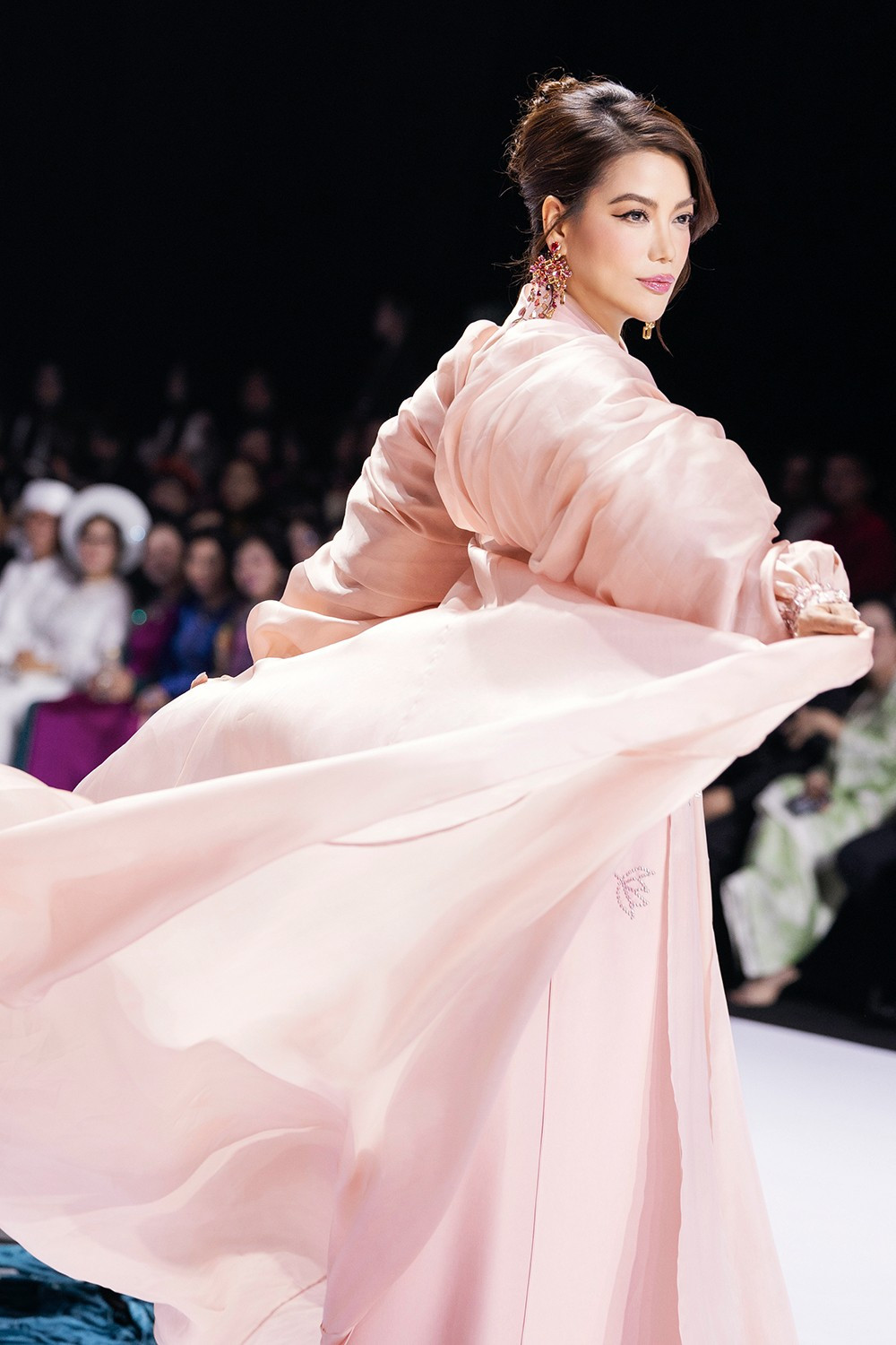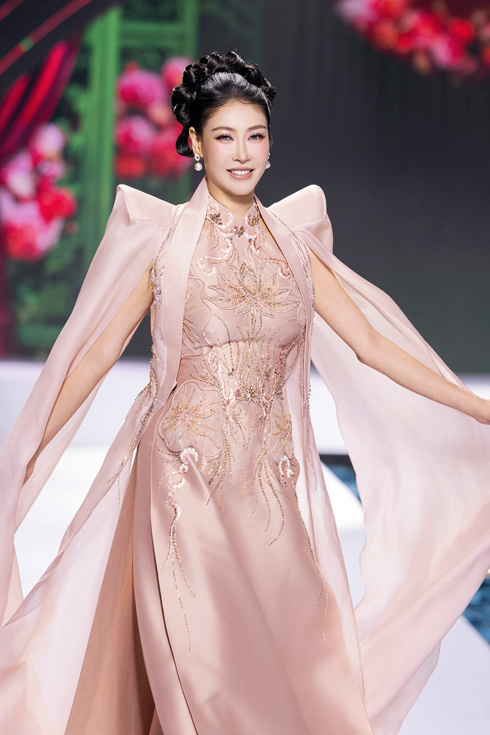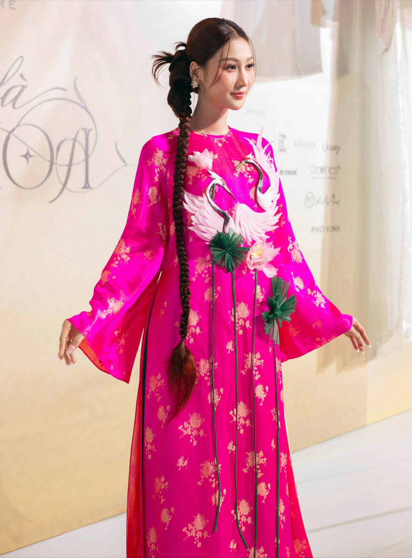 Trước đó, dàn người đẹp xuất hiện lộng lẫy trên thảm đỏ trong những thiết kế áo dài độc đáo. Hoa hậu Đỗ Thị Hà dịu dàng trong áo dài màu hồng pastel, đính hoa trắng.