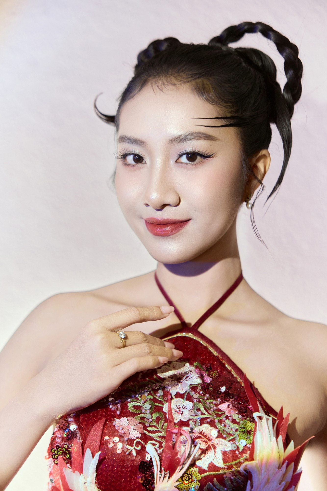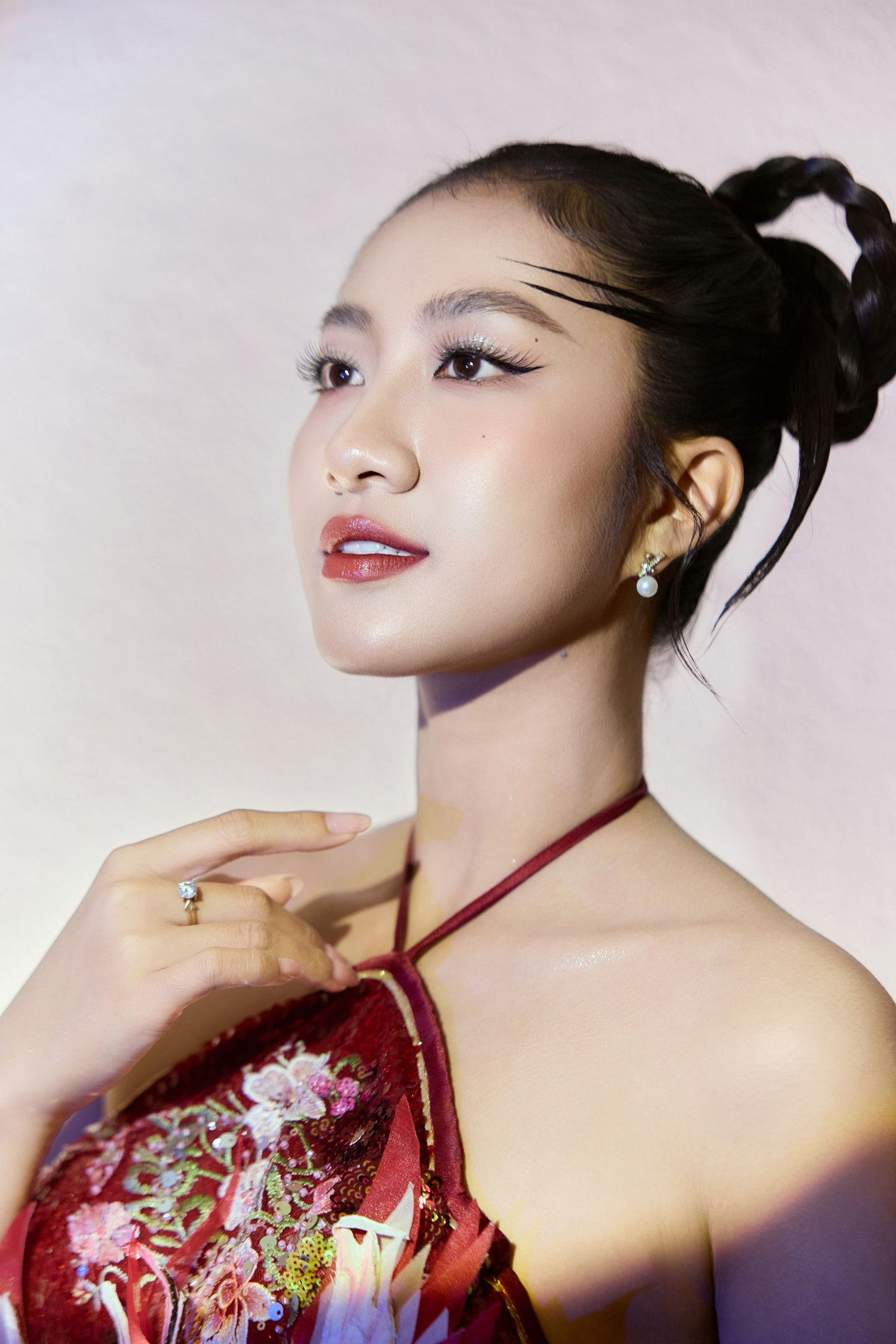 Á hậu Mỹ Anh - đại diện Việt Nam tại Hoa hậu Trái Đất 2025 trình diễn mẫu váy cổ yếm cầu kỳ.