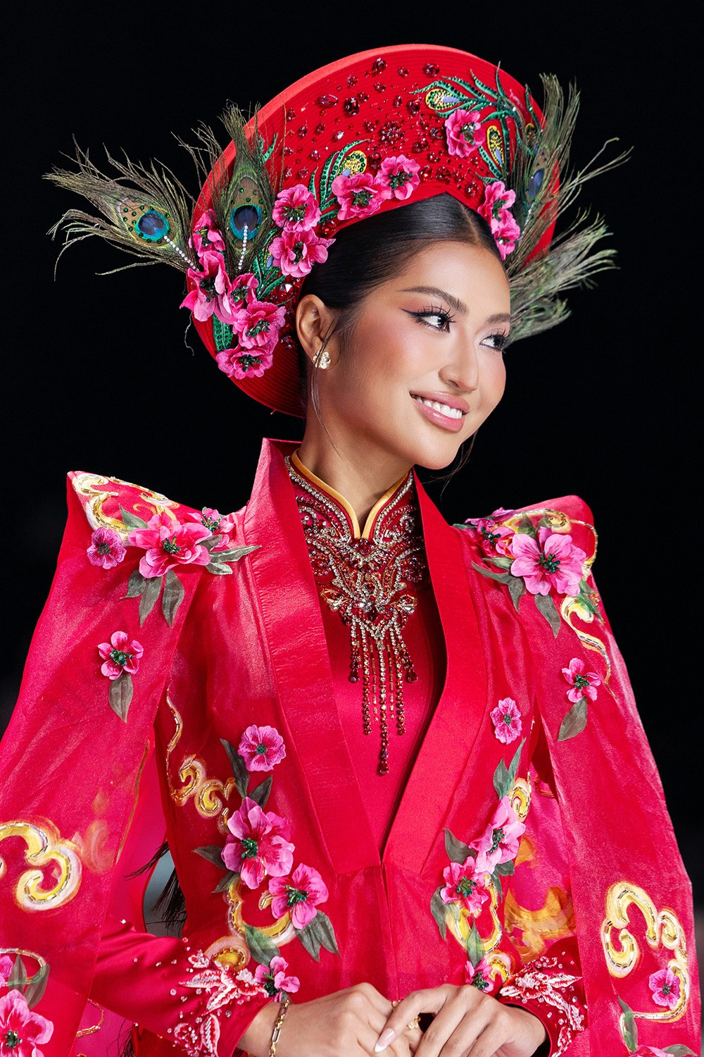 Đương kim Miss Cosmo Ketut Permata Juliastrid trình diễn mẫu áo dài, khăn đóng được đính kết cầu kỳ, lộng lẫy.