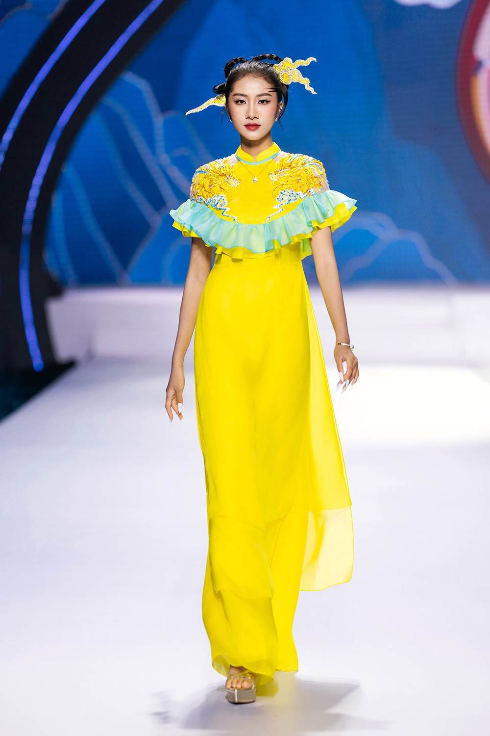 Người đẹp Đắk Lắk thay bộ áo dài tông màu vàng nổi bật khi trình diễn trên sàn catwalk. Tuy là tên tuổi mới trên sàn diễn thời trang nhưng Hoa hậu Việt Nam 2024 vẫn ghi điểm bởi sự chuyên nghiệp và phong thái cuốn hút.