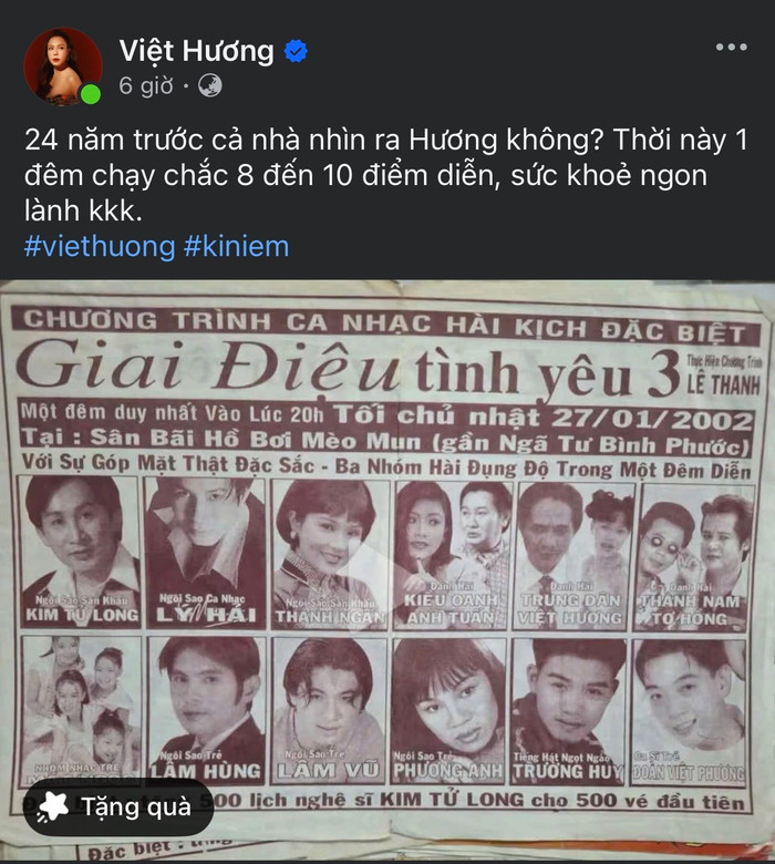 Trên trang cá nhân, Việt Hương vừa đăng tải poster của một chương trình ca nhạc hài kịch từ tận 24 năm trước. Đáng chú ý, nữ nghệ sĩ cho biết có sự xuất hiện của bản thân khiến nhiều khán giả không khỏi tò mò và thích thú.