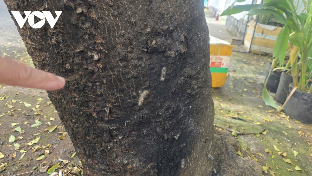 Người dân cho biết, những ngày trước, các cây bàng Đài Loan bên đường xuất hiện rất nhiều sâu róm. Chúng bò khắp thân cây, tán cây, tạo thành một "tấm thảm" dày đặc vây quanh thân cây. Thậm chí, chúng còn trèo lên tường nhà và bò vào bên trong.