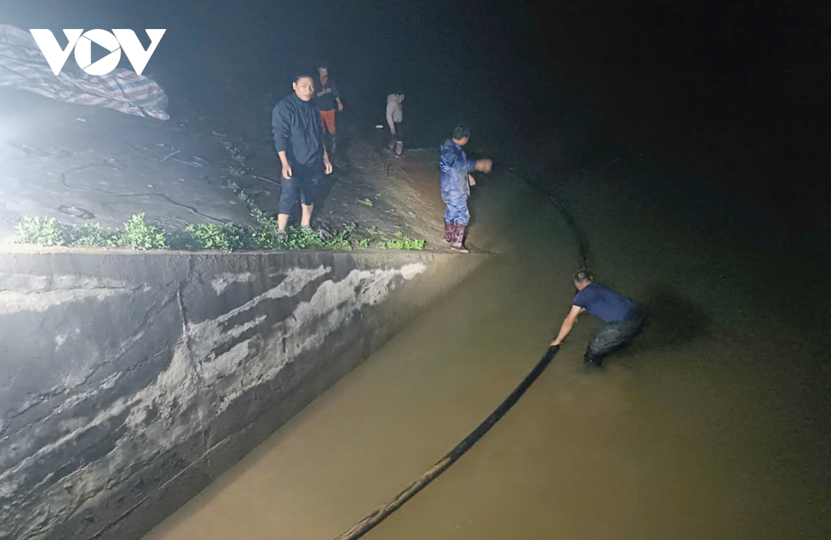 Ống nhựa được lực lượng chức năng sử dụng để xả nước khỏi hồ Cay An nhằm giảm áp lực lên thân đập