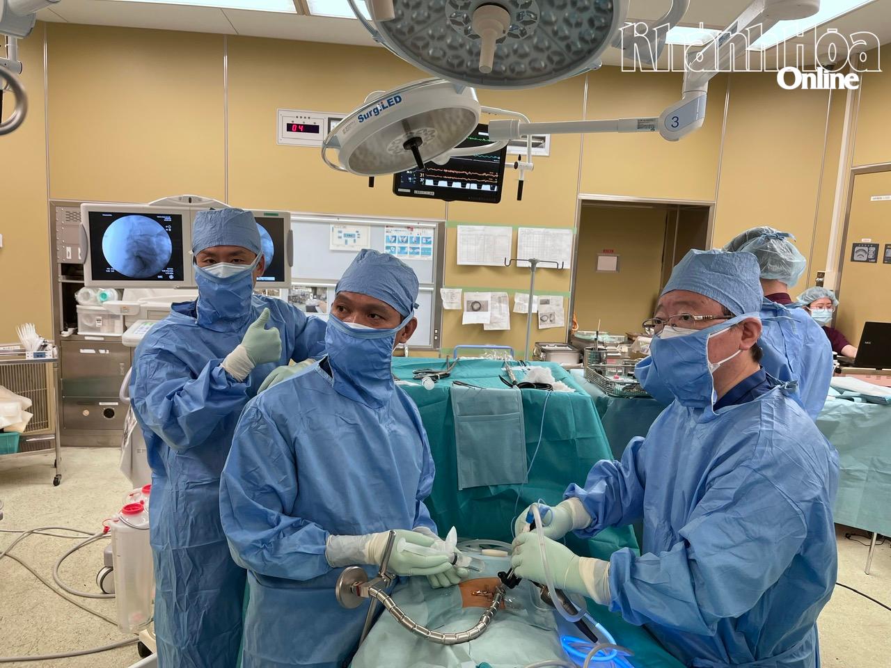 Bác sĩ Trần Hoàng Mạnh được giáo sư Đại học Y khoa Wakayama (Nhật Bản) hướng dẫn thực hành phẫu thuật nội soi cột sống.