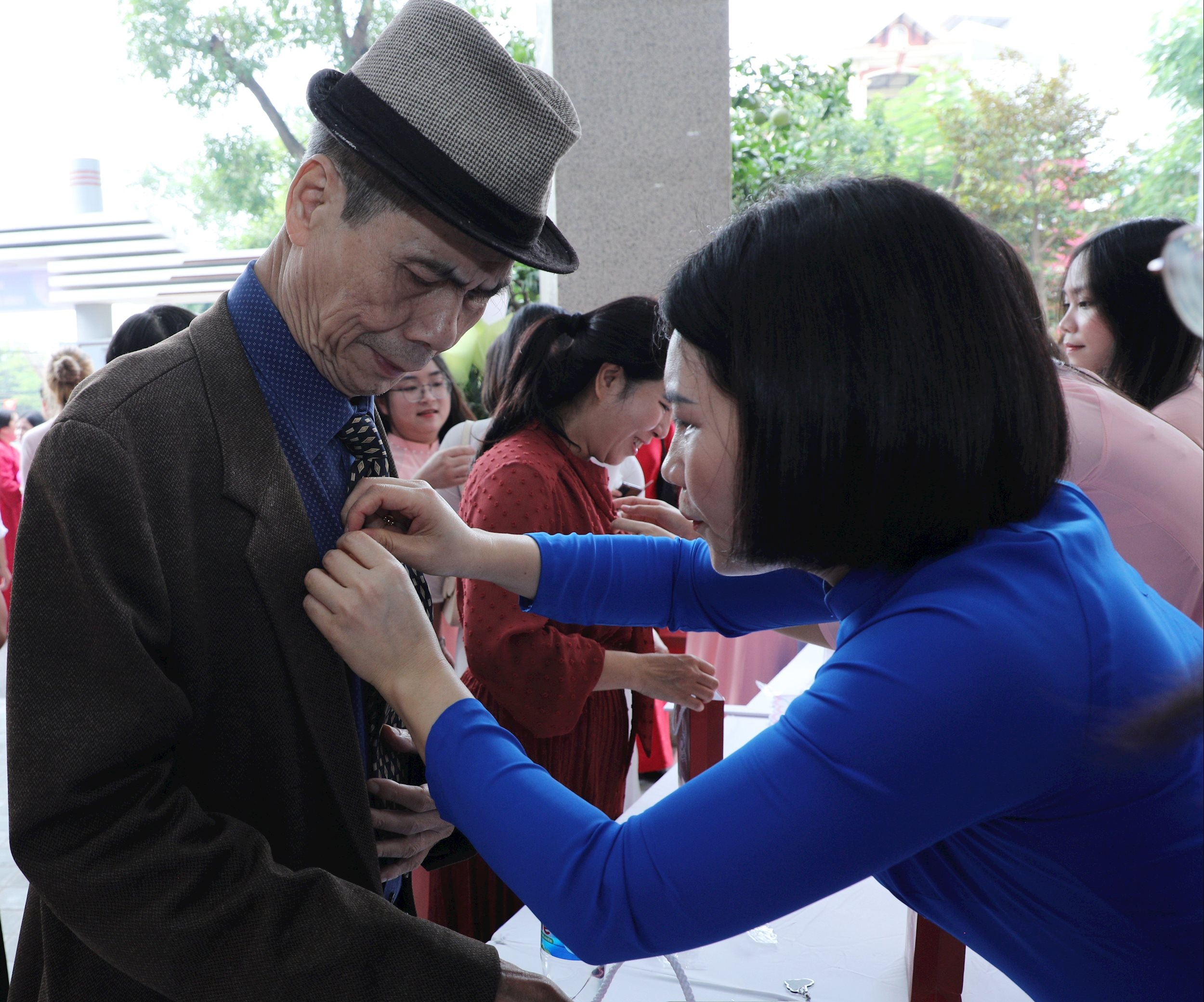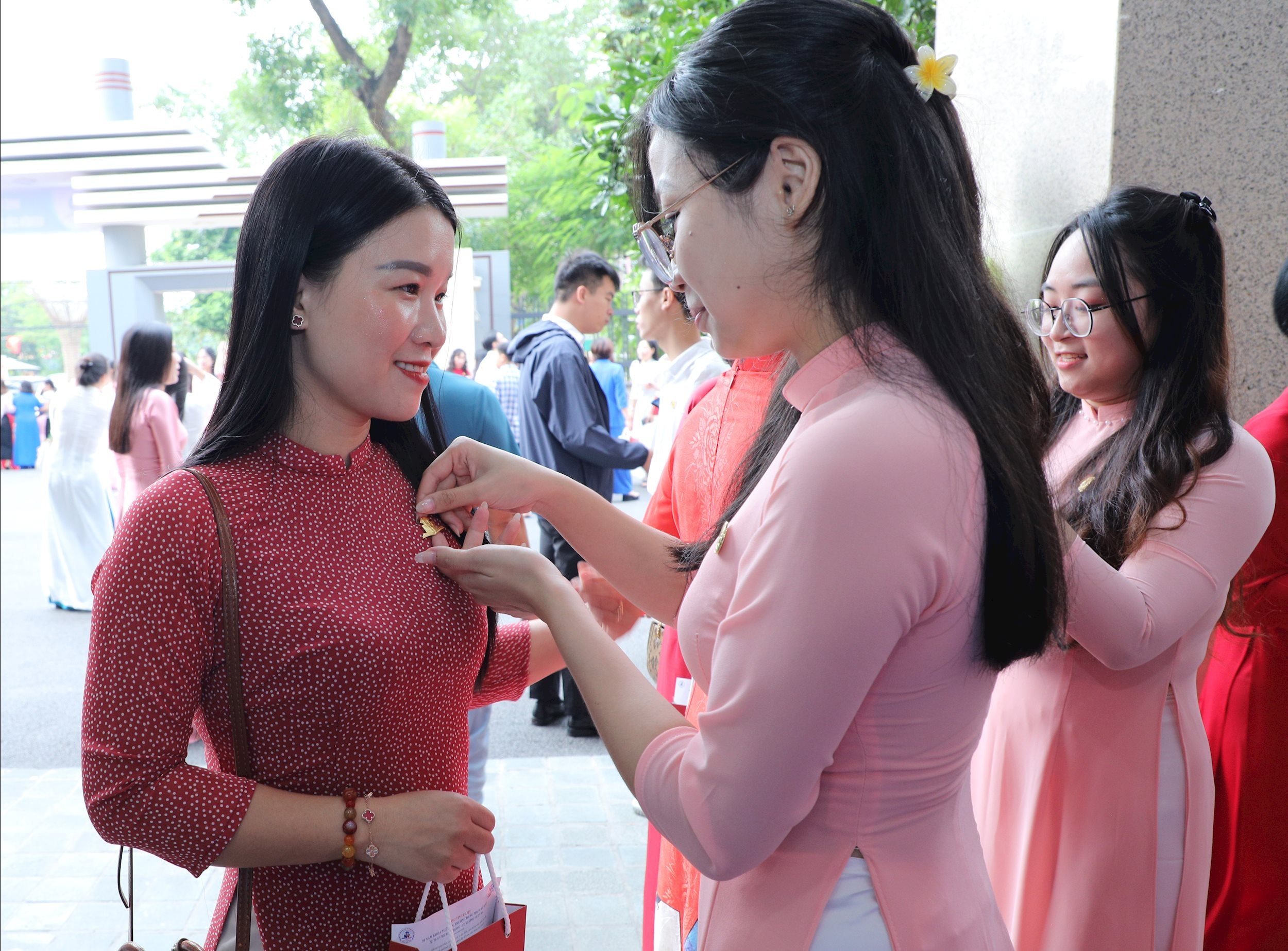 Sinh viên Khoa Ngữ văn gắn phù hiệu của khoa lên các cựu sinh viên tham dự buổi lễ