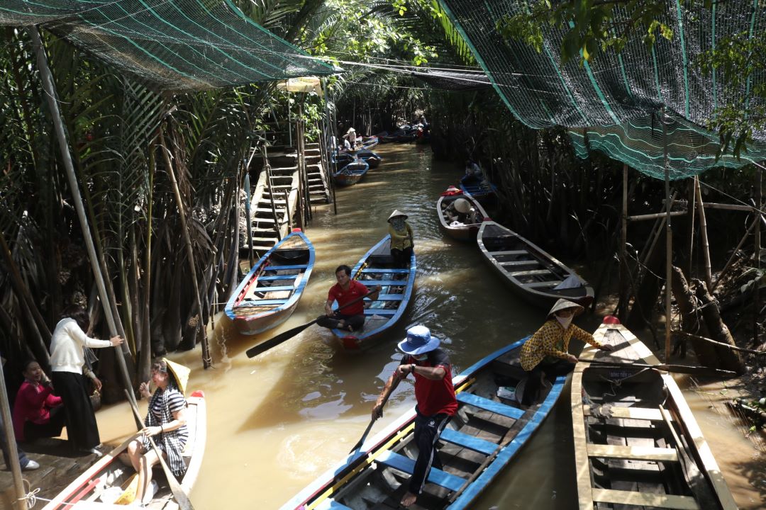 Du khách trải nghiệm đi đò trên rạch nhỏ. Ảnh: T.Đào