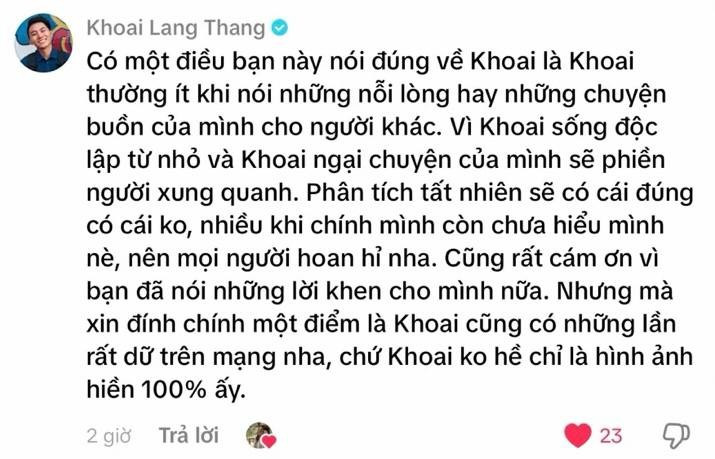 Thậm chí dưới bình luận của video, Khoai Lang Thang cũng đã để lại phản hồi. Anh chia sẻ người này nói đúng một điều về bản thân anh, đó là ít nói nỗi lòng mình cho người khác. Tuy nhiên, anh cũng đính chính là "có những lần rất dữ trên mạng, không chỉ là hình ảnh hiền 100%".