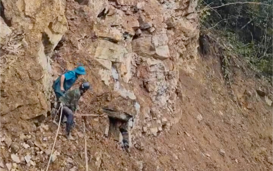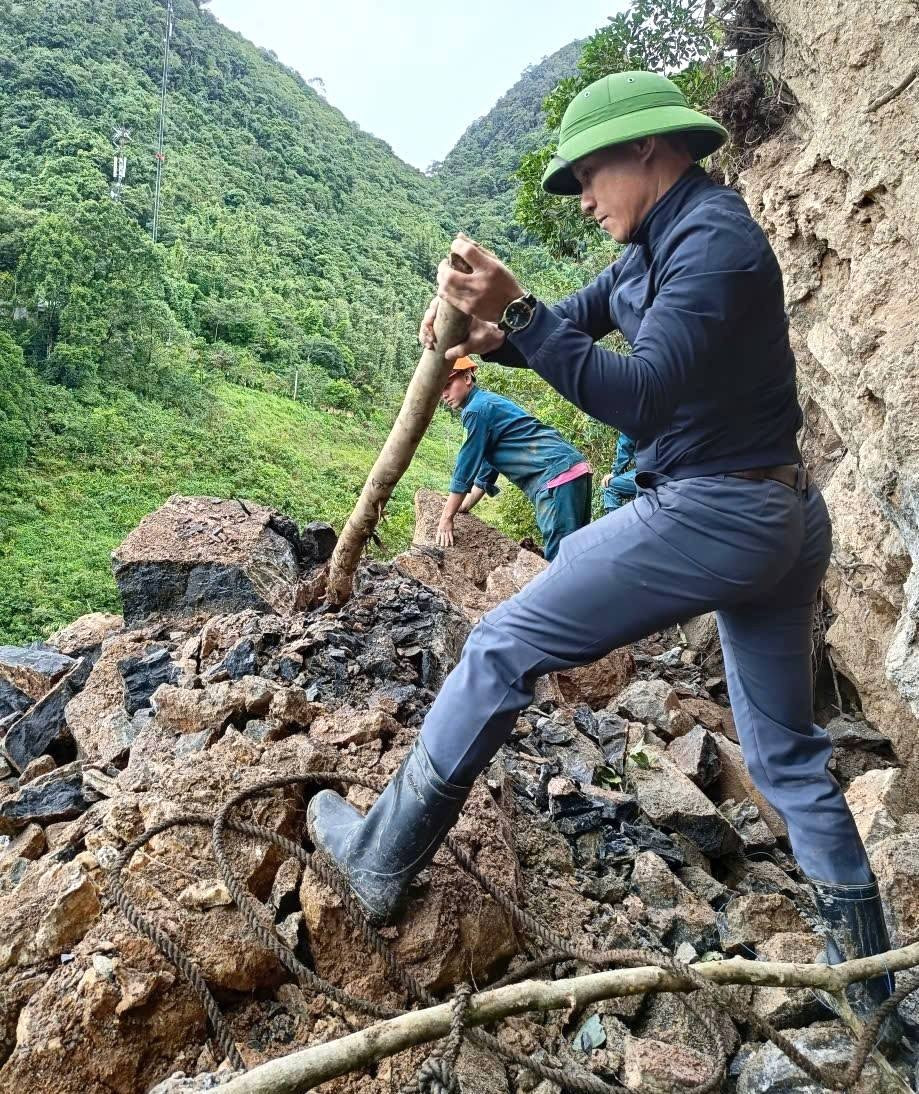 Chính quyền xã Mường Lống huy động lực lượng chức năng cạy đá trên vách núi nhưng lượng đá quá nhiều nên không thể thực hiện.