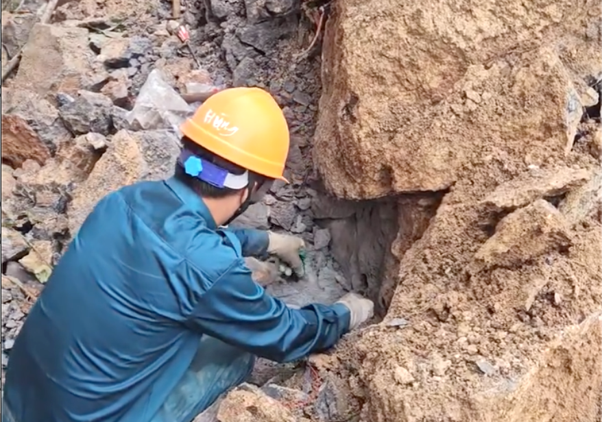 Lực lượng chức năng khoan đá, nổ mìn để thông đường vào các bản bị cô lập.