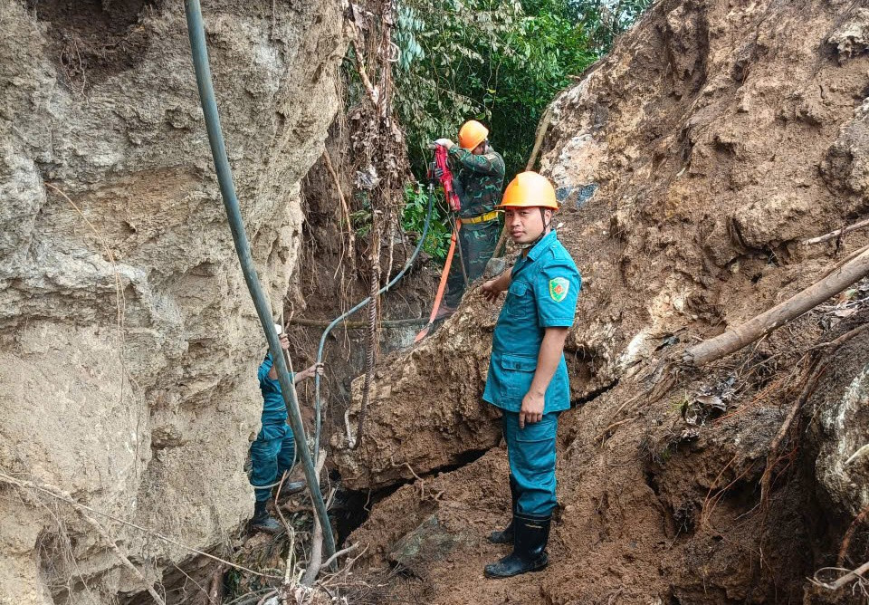 Khi các tảng đá được giải phóng, lực lượng dân quân tự vệ xã được huy động mang vác vật liệu để mở đường cho người dân đi lại.
