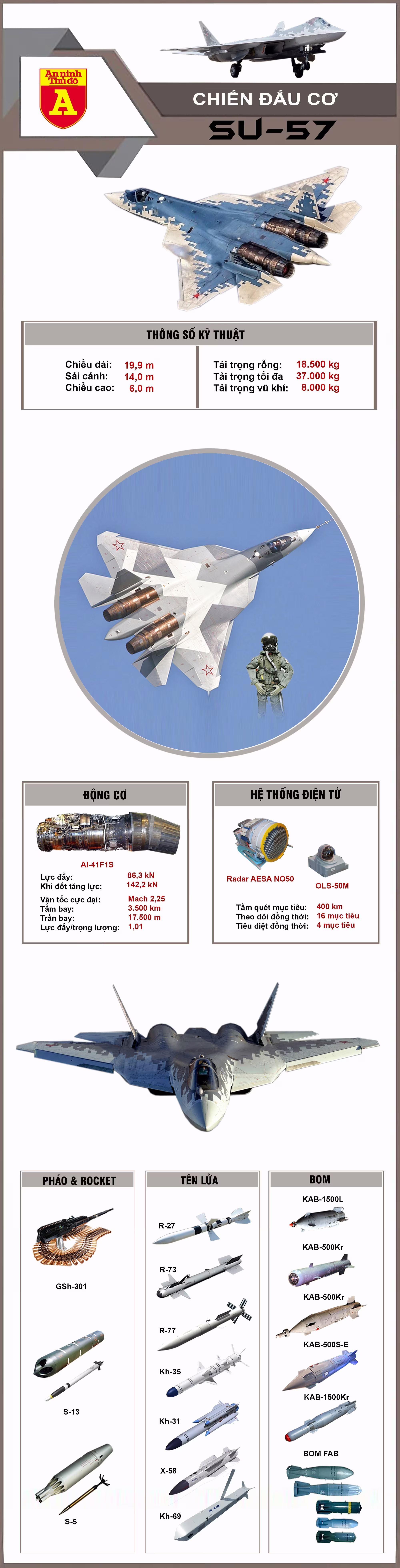 Mỗi tiêm kích Su-57 có thể mang tổng cộng 6 quả tên lửa trong thân, gồm 4 quả ở 2 khoang bụng và 2 tên lửa đối không tầm ngắn trong 2 khoang bên hông.