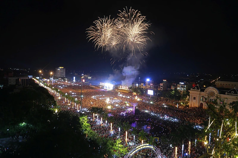 Màn pháo hoa rực rỡ tại Quảng trường Lam Sơn chào đón năm mới. Ảnh: LH