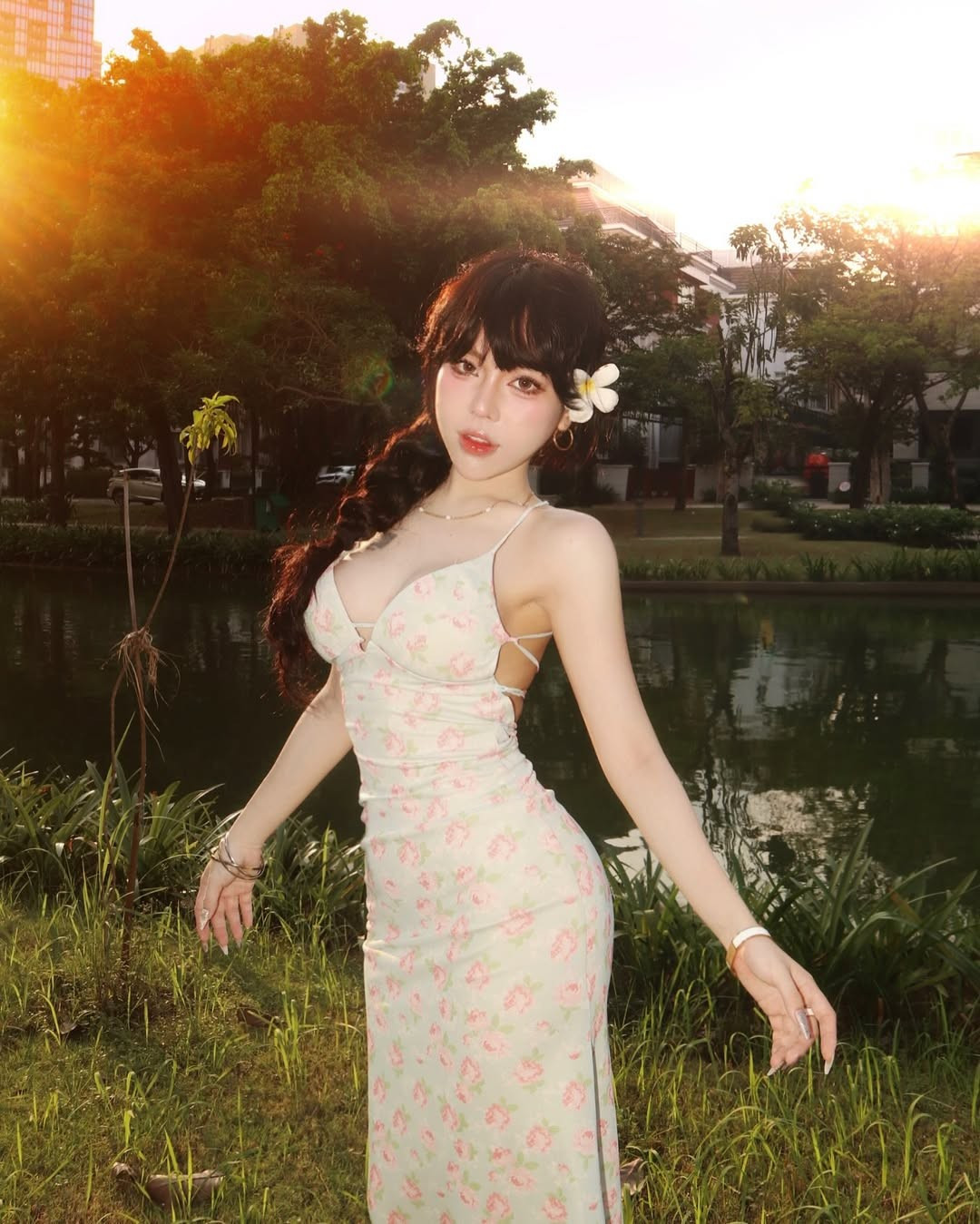 Bảo Khuyên chọn diện một chiếc đầm maxi dáng ôm màu xanh mint nhẹ nhàng, điểm xuyết họa tiết hoa hồng nhỏ xinh. (Ảnh: IGNV)