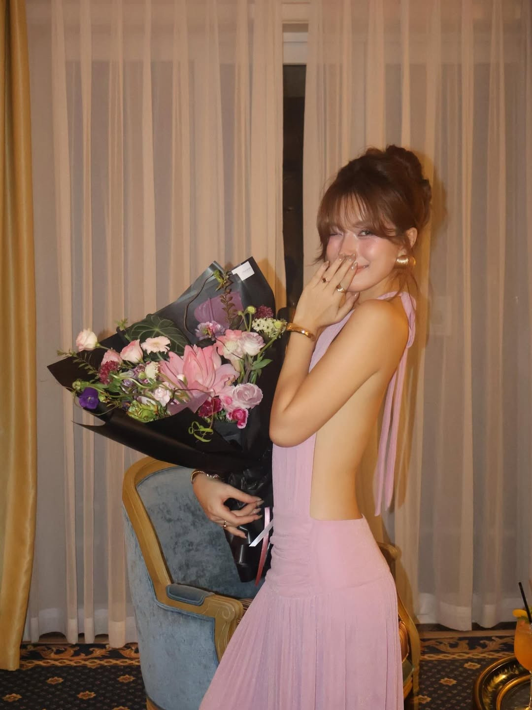 Thụy Hân khoe vẻ đẹp quyến rũ trong hai bộ cánh dự tiệc khác nhau, một chiếc đầm dài, ôm sát body, khoe vai trần gợi cảm và đường xẻ tà cao tinh tế và một chiếc đầm hồng thướt tha với chi tiết cổ yếm, tôn lên sự nữ tính và vóc dáng chuẩn.