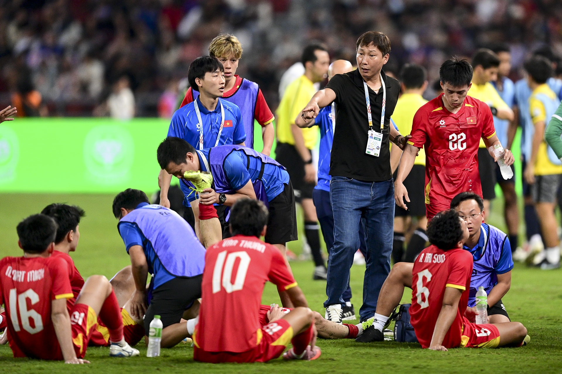 Các cầu thủ U22 Việt Nam tri ân HLV Kim Sang-sik sau khi nhận tấm HCV SEA Games 33. "Đầu năm là chức vô địch cùng tuyển quốc gia, giờ là U22. Tôi rất hạnh phúc. Thành tích này đến nhờ tinh thần không bỏ cuộc của các cầu thủ, dù bị dẫn đến 2 bàn. Tôi rất tự hào", nhà cầm quân người Hàn Quốc chia sẻ sau trận đấu.