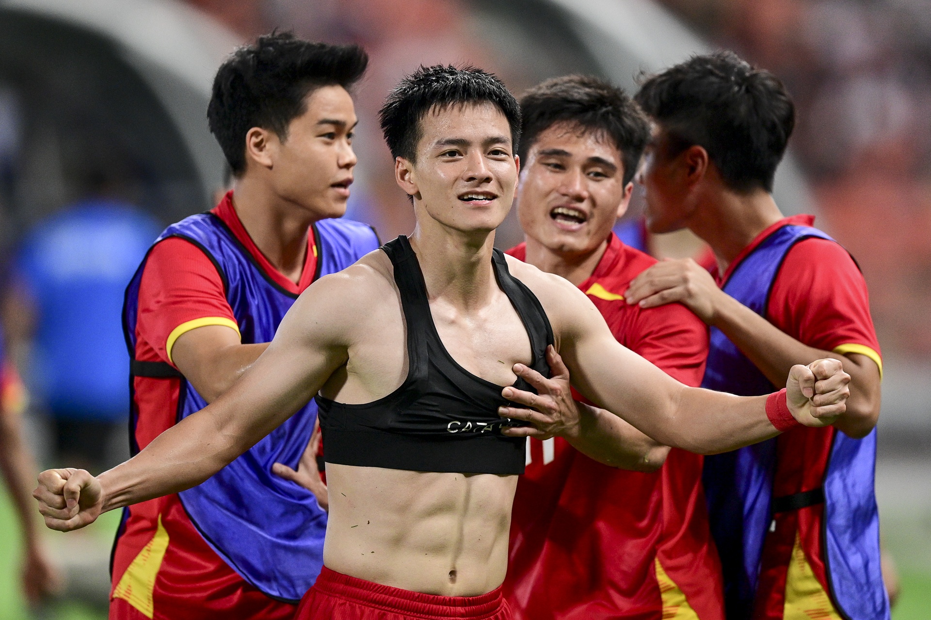 Ngay phút thứ 6 của hiệp phụ thứ nhất, U22 Việt Nam vượt lên dẫn 3-2 sau pha đá bồi của Thanh Nhàn. Anh chàng không giấu nổi niềm vui, anh cởi áo ăn mừng.