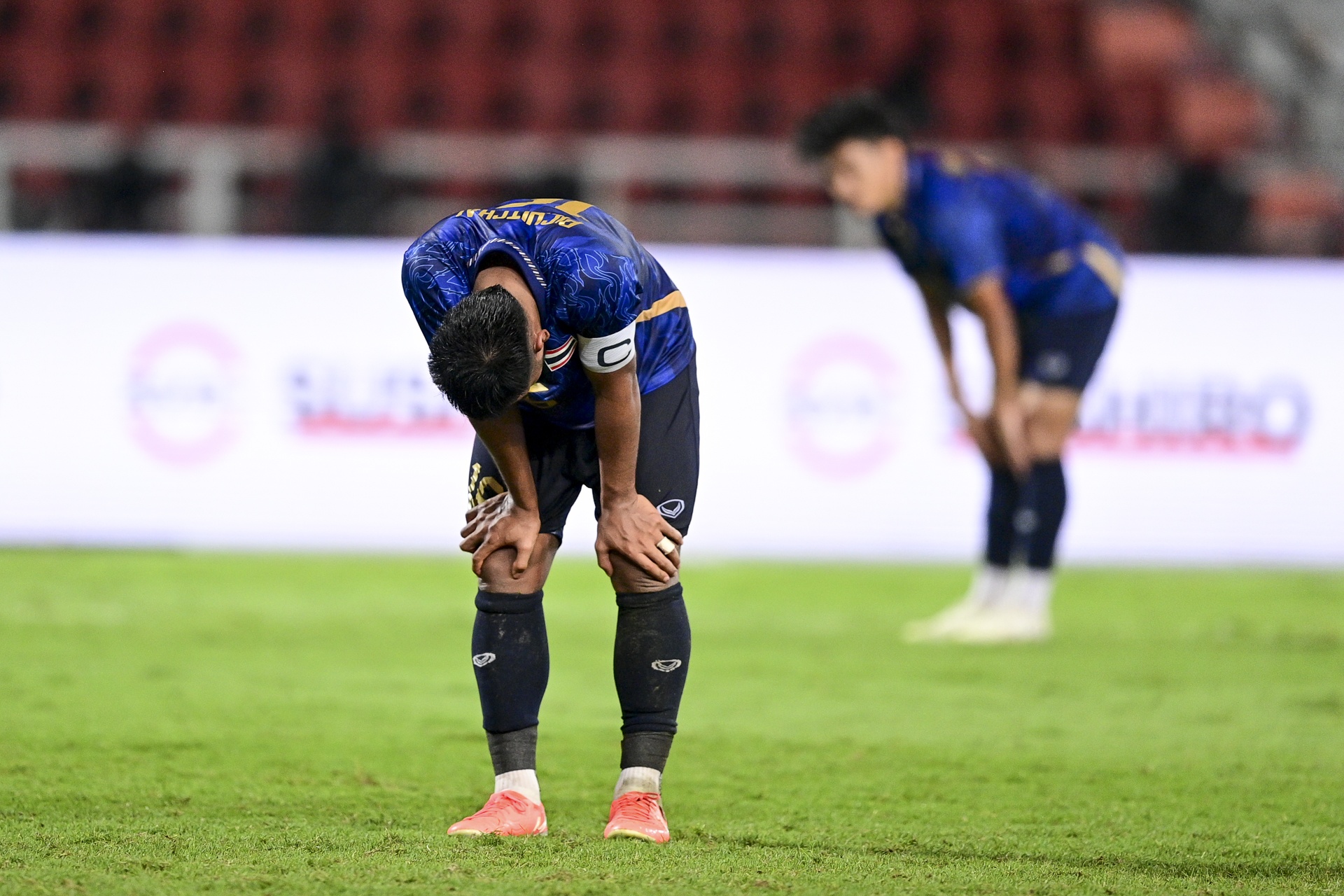 Các cầu thủ Thái Lan gục ngã khi tiếng còi kết thúc trận đấu vang lên. Dẫn trước 2-0 với thế trận áp đảo trong hiệp 1 nhưng rồi bị lội ngược dòng 2-3 trước hàng nghìn khán giả nước nhà.