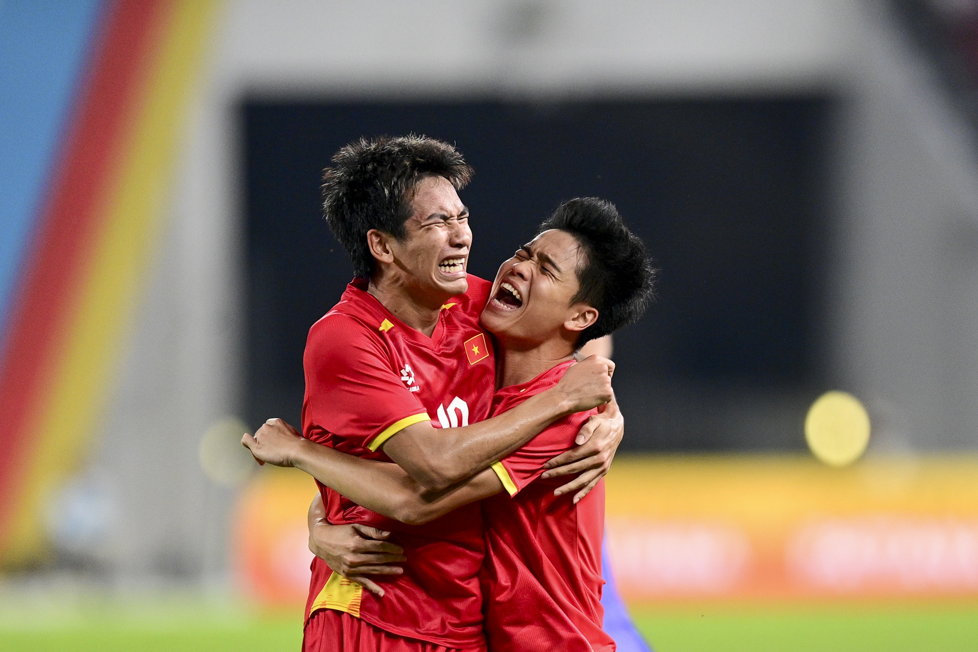 Ngay khi tiếng còi mãn cuộc của trọng tài vang lên, Văn Thuận (trái) ôm chầm lấy đồng đội, anh khóc nức nở vì hạnh phúc.