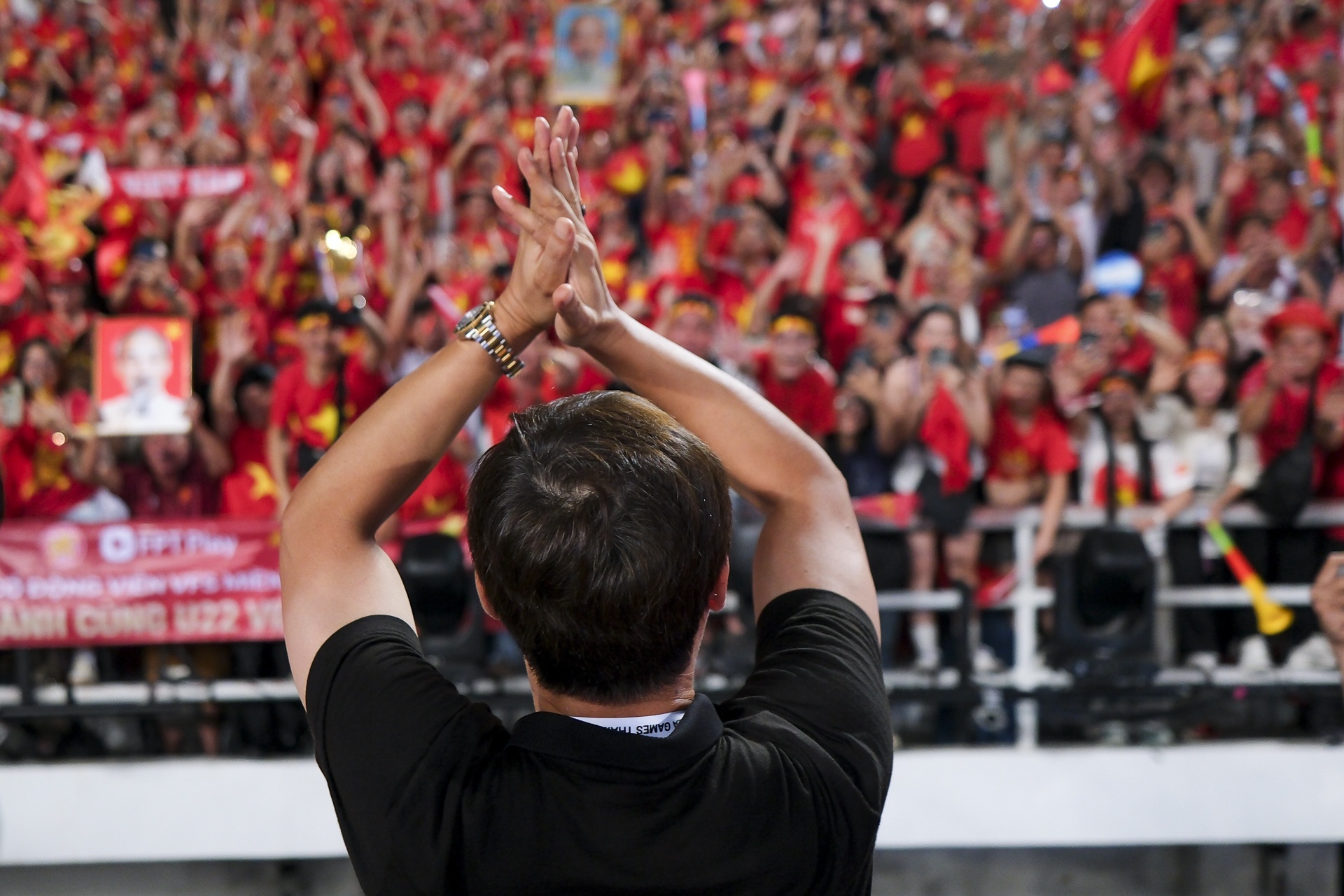 HLV Kim Sang-sik chắp tay cảm ơn những người hâm mộ Việt Nam khi đã đồng hành cùng tuyển U22 trong suốt chiến dịch SEA Games 33.