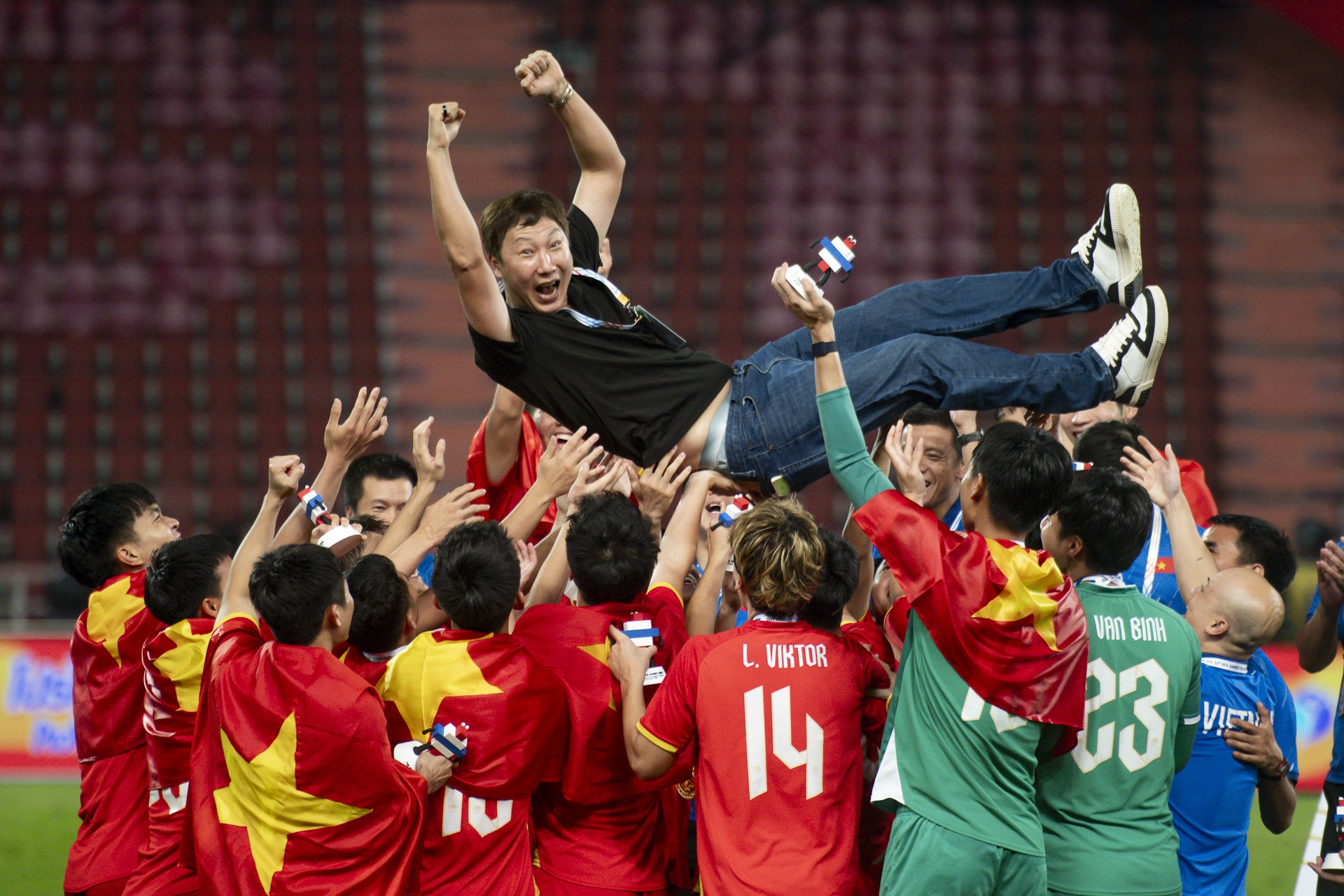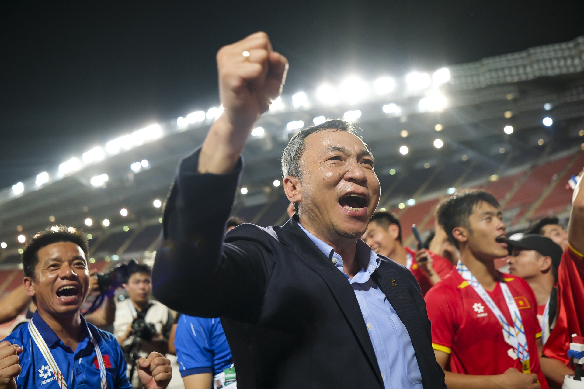 Ông Trần Quốc Tuấn, Chủ tịch Liên đoàn Bóng đá Việt Nam (VFF), xuống sân ăn mừng cuồng nhiệt cùng cầu thủ, cổ động viên Việt Nam.
