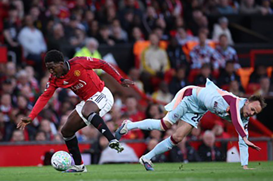 Mainoo có pha đi bóng như Maradona nhưng đường chuyền của anh cho Amad lại không thể chuyển hóa thành bàn thắng cho MU. ẢNH: EPA