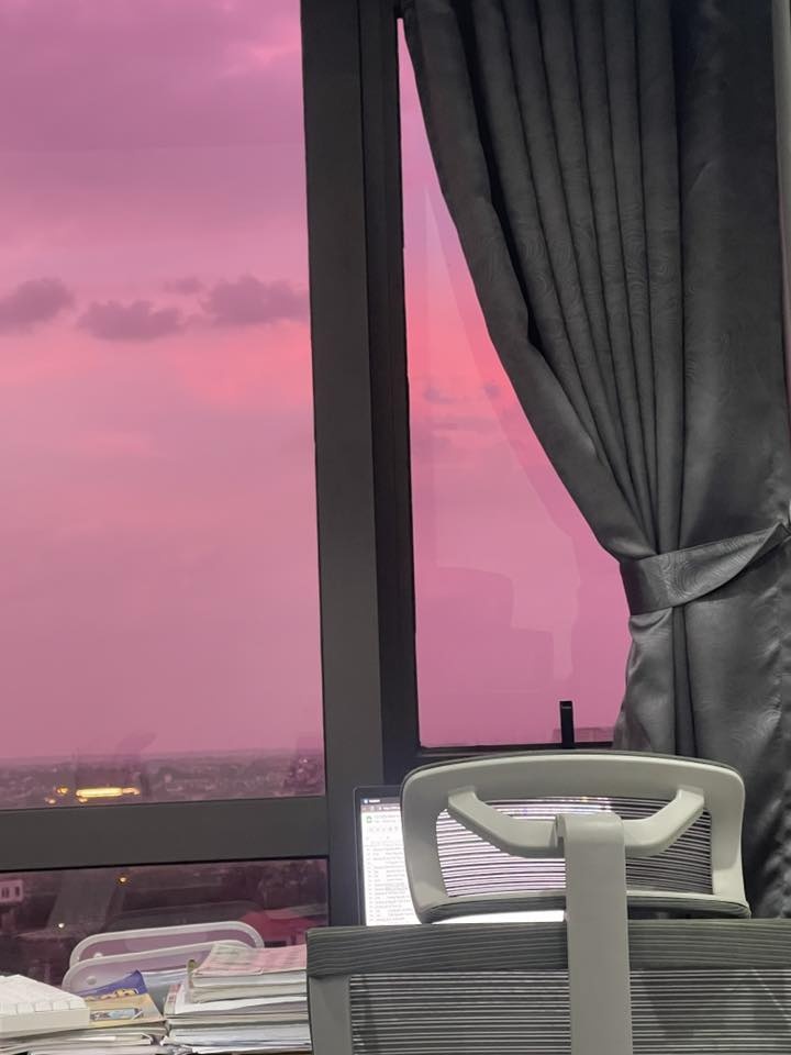 Nhiều người chứng kiến khoảnh khắc tương tự cũng để lại bình luận. "Ngồi trong phòng làm việc nhìn ra cửa sổ, trời tím pha chút hồng nhìn rất lãng mạn", chị Nguyễn Thị Thanh Long cho hay.