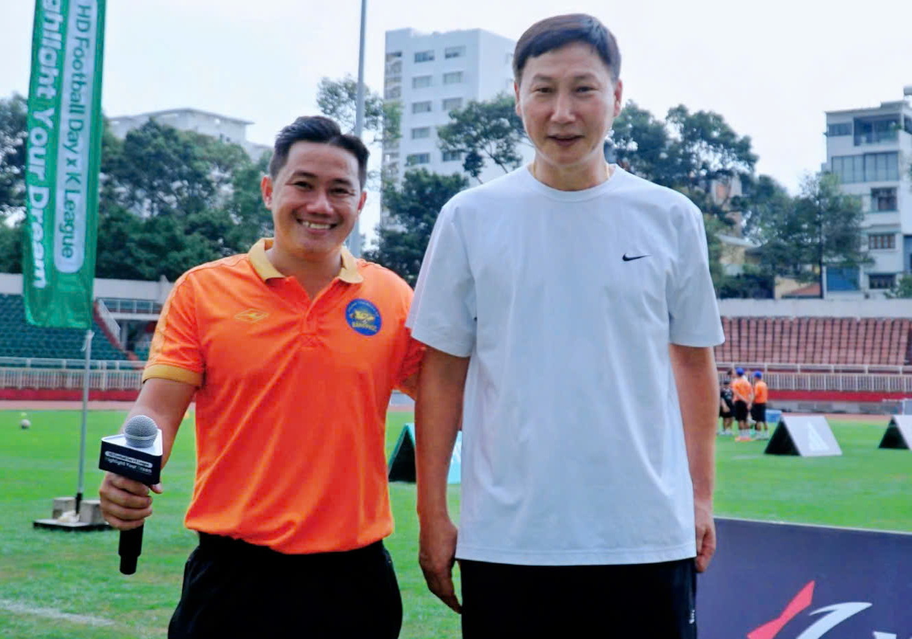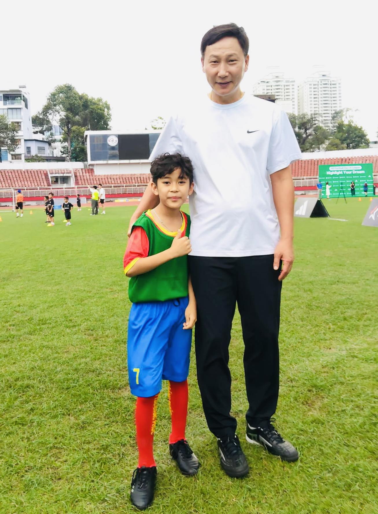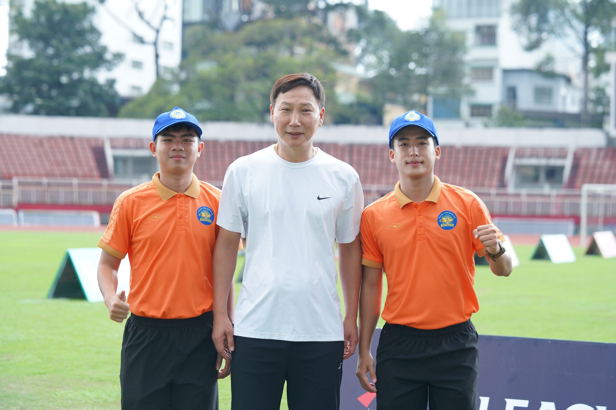 HLV Kim Sang-sik chụp hình lưu niệm cùng CEO của Trung tâm Bóng đá Đăng Phúc.