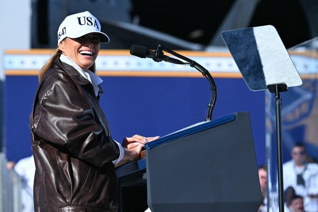 Tại sự kiện, Đệ nhất phu nhân Mỹ mặc áo khoác da nâu kiểu bomber, kết hợp cùng áo sơ mi trắng có cổ và quần jeans xanh đậm. Bà hoàn thiện vẻ ngoài của mình với cặp kính râm phi công, đội mũ lưỡi trai trắng có thêu chữ “USA” ở phía trước và đi giày lười màu đen.