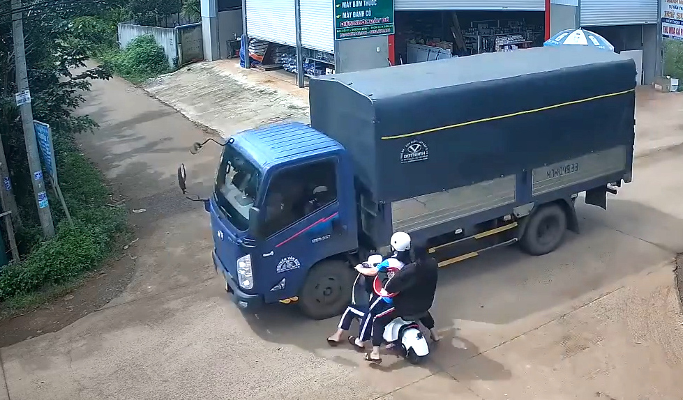 Xe đạp điện "kẹp ba" va chạm với xe tải, một em tử vong, hai em bị thương. (Ảnh cắt từ clip)