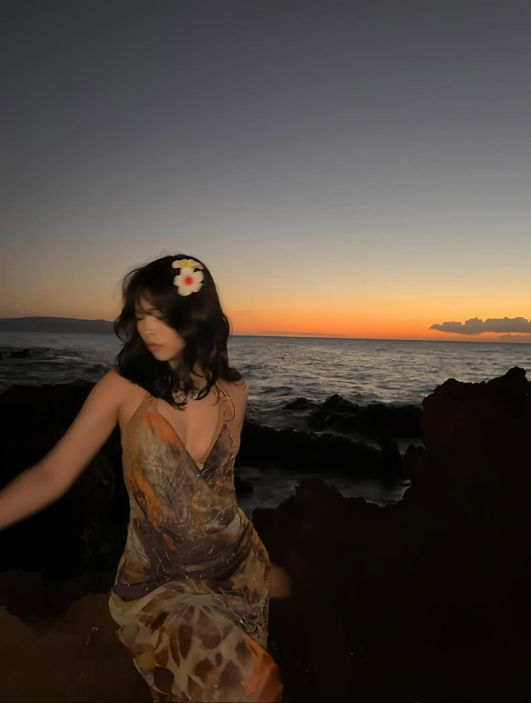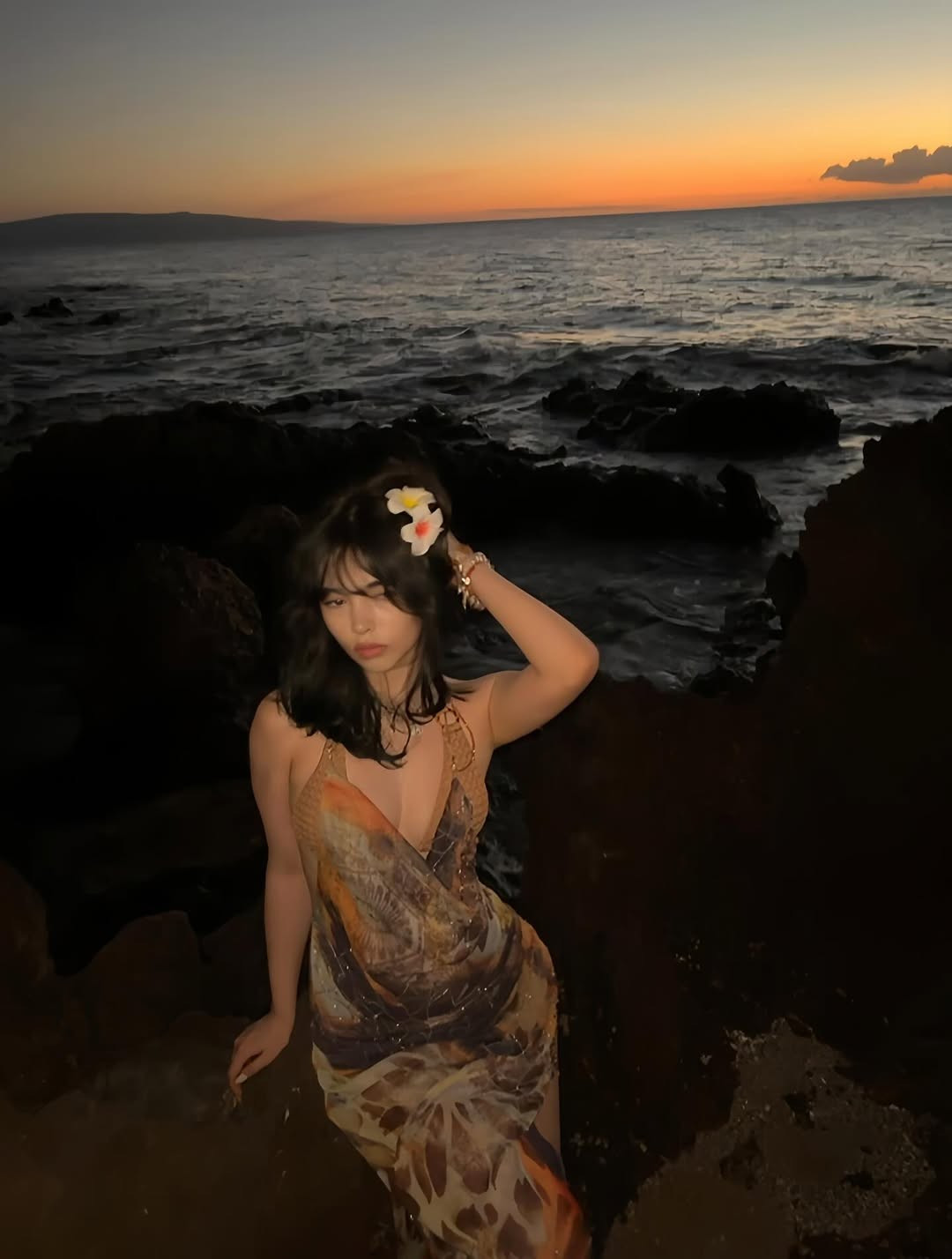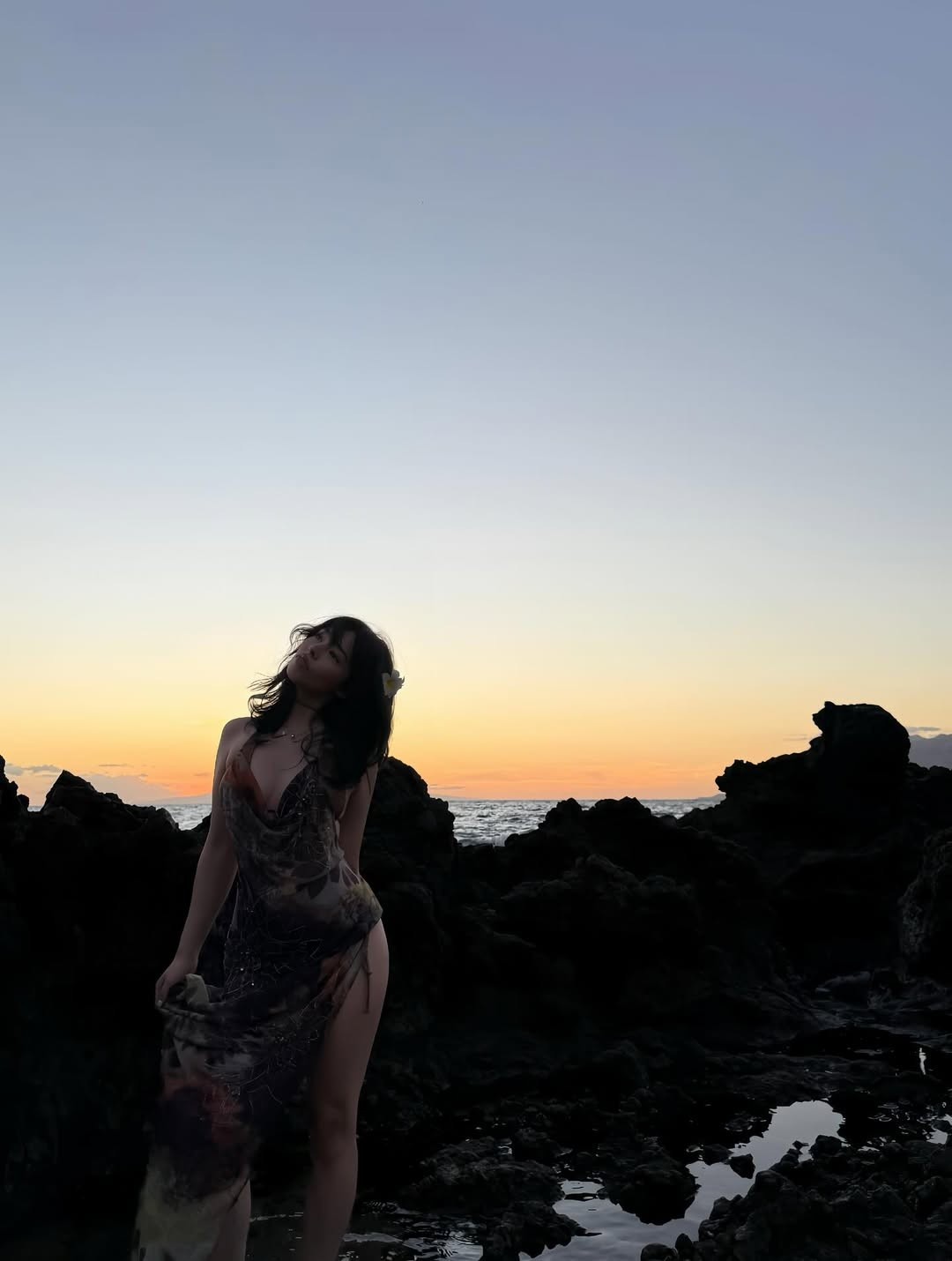Bức ảnh gây sốt được chụp tại một bờ biển đầy đá, dưới ánh sáng vàng cam rực rỡ của buổi chiều tà. Đây không chỉ là một bức ảnh selfie đơn thuần; đó là một tác phẩm nghệ thuật về ánh sáng và bố cục.