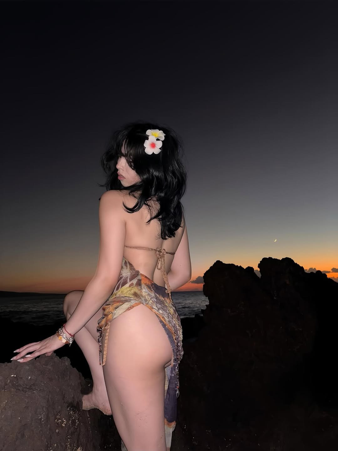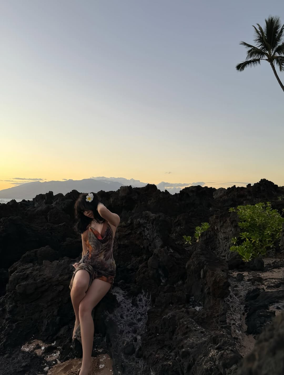 Kanii chọn một chiếc váy maxi hở lưng, được cắt xẻ táo bạo với họa tiết thổ cẩm mang hơi hướng mùa hè phóng khoáng. Cô quỳ nhẹ nhàng trên tảng đá, để tấm lưng trần cùng đường cắt xẻ cao của chiếc váy trở thành điểm nhấn.